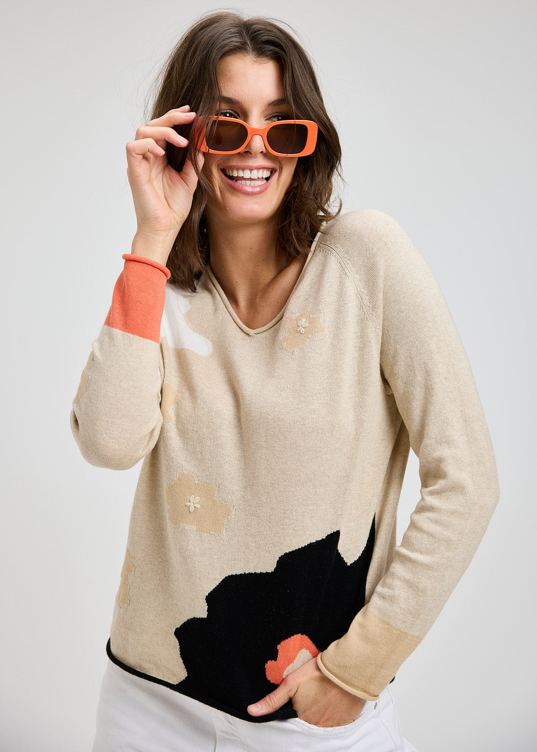 Designed with a flattering V-neckline and a slightly cropped fit, it’s perfect for pairing with high-rise denim, skirts, or relaxed trousers. Bright, artistic, and full of personality, this sweater captures everything we love about Zaket & Plover—unexpected details and feel-good style that stands out without trying too hard.