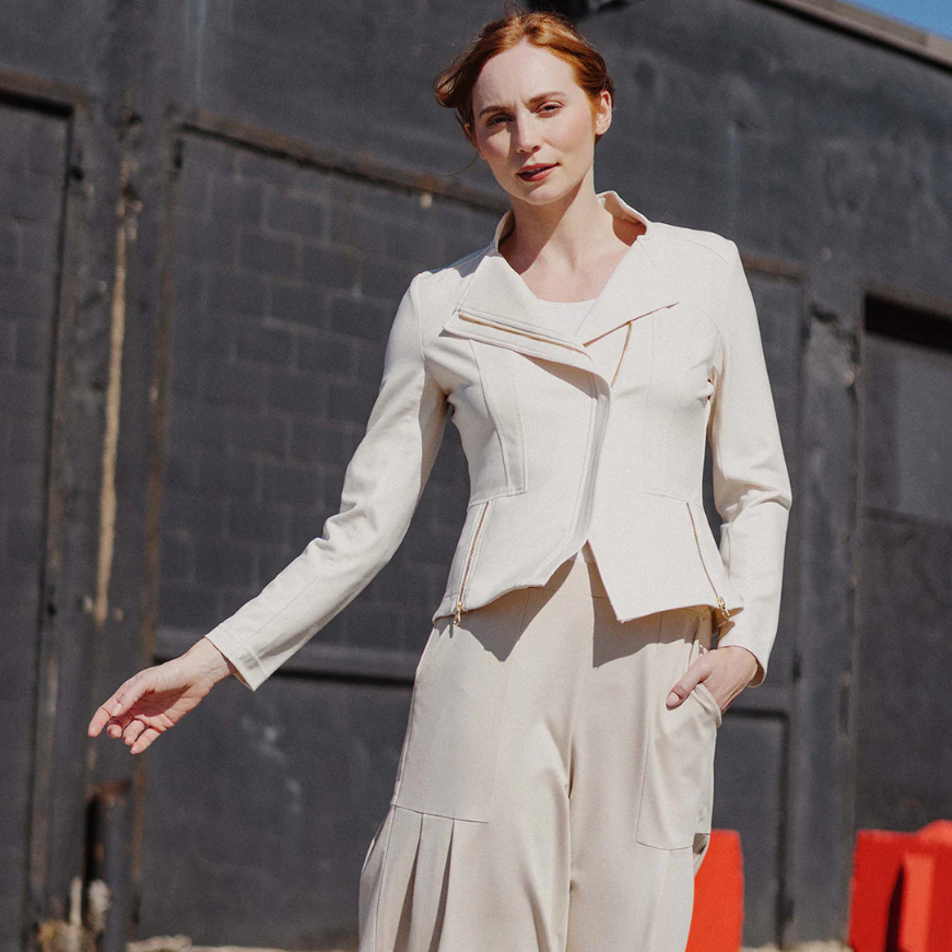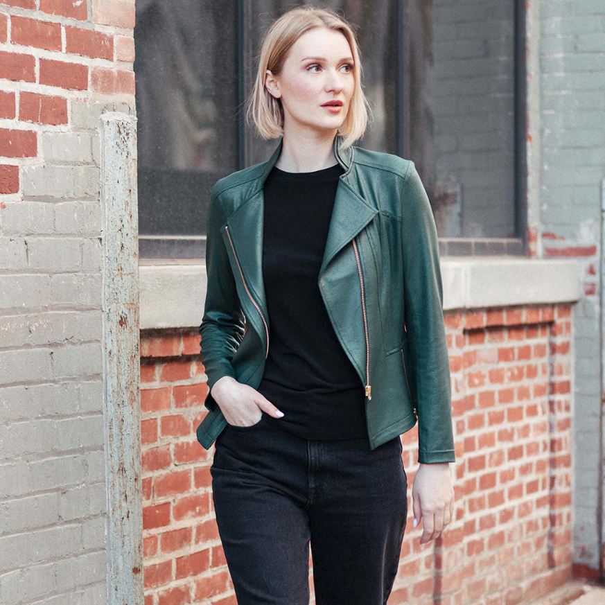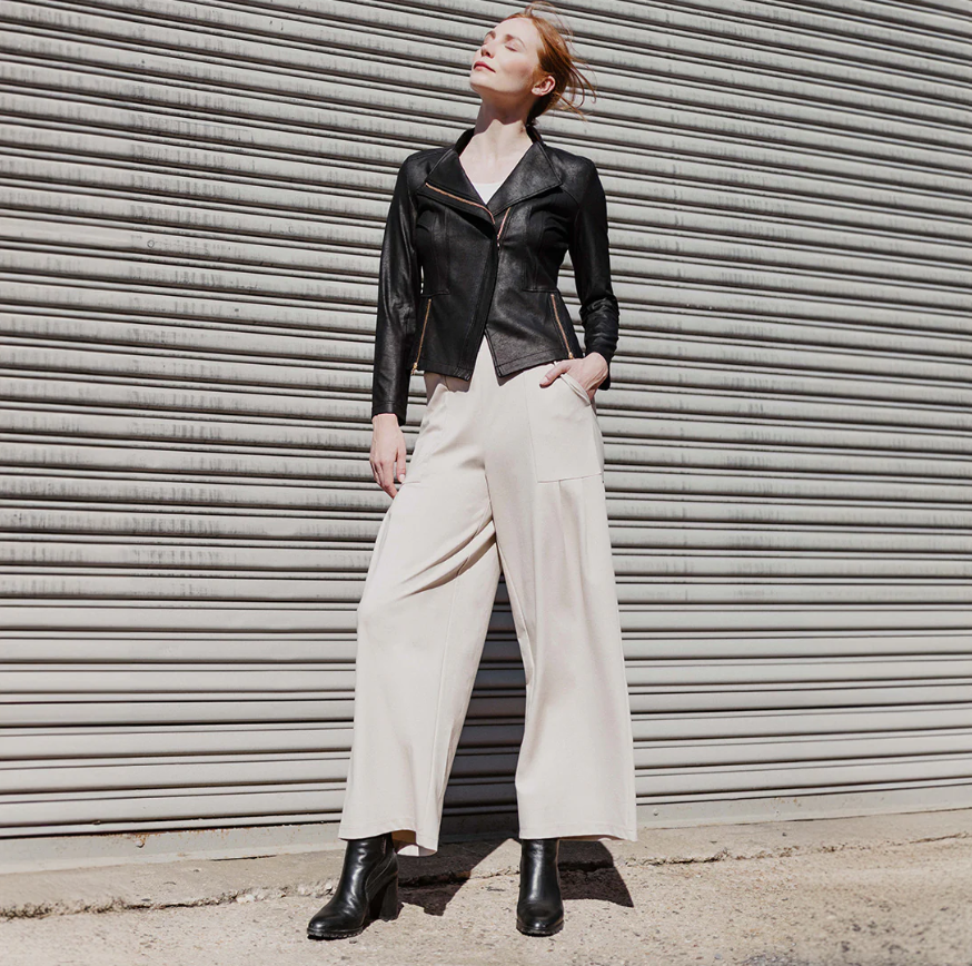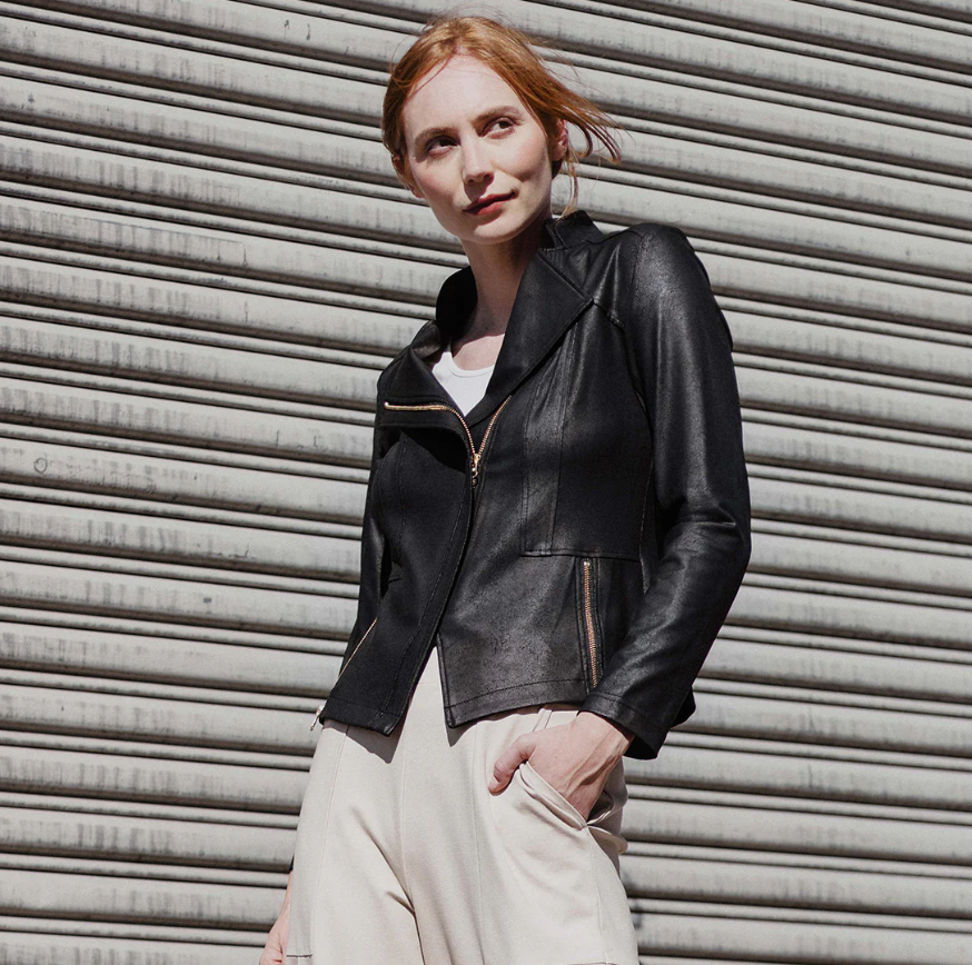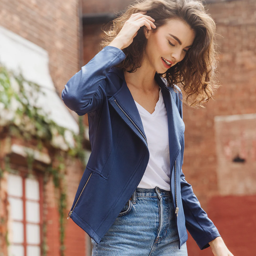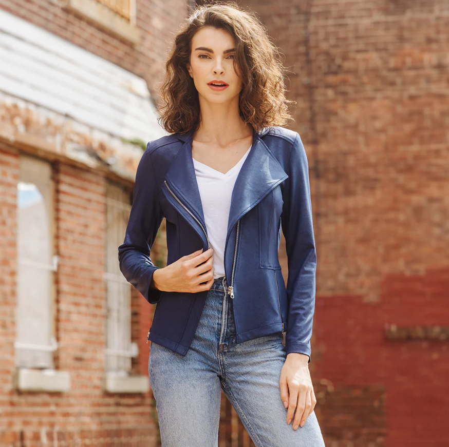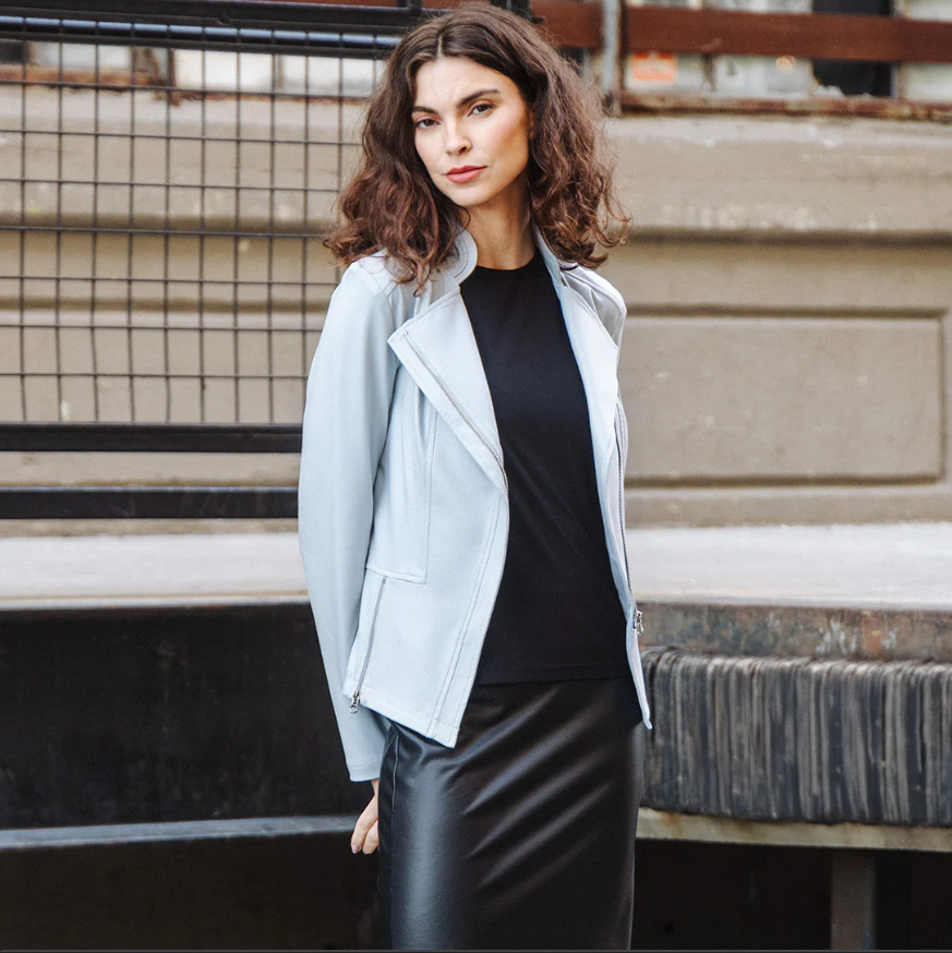 Looking for the next best thing to add to your wardrobe? Well, you'll leave no stone unturned when it comes to our Liquid Leather Signature Jacket! Made from our beautiful signature stretch knit, extremely lightweight soft "lambskin feel" fabric with a soft matte finish. This jacket features a notched lapel with upright collar, long sleeves, silver a-symmetrical zip closure, faux pocket zipper slits as well as complimentary detailed front and backstitching.