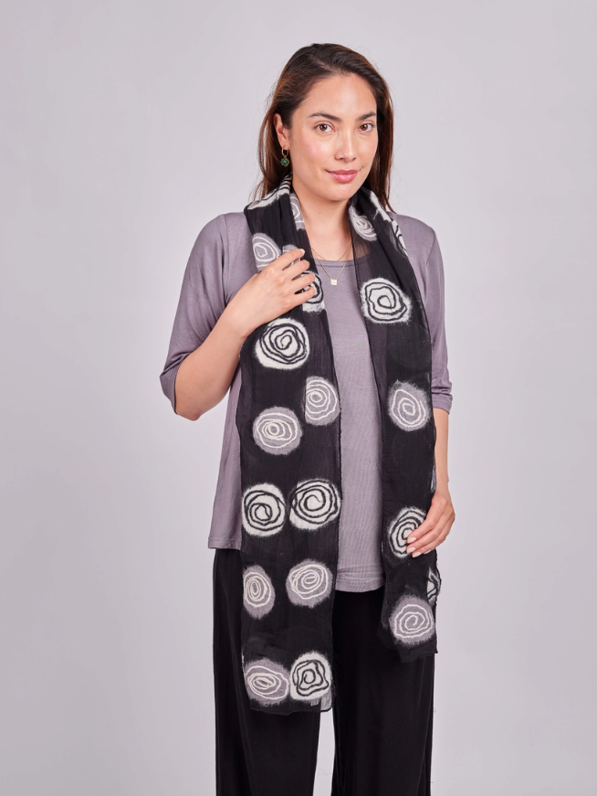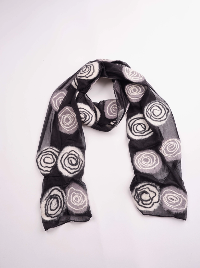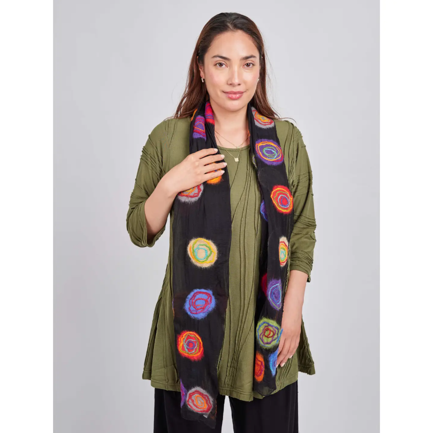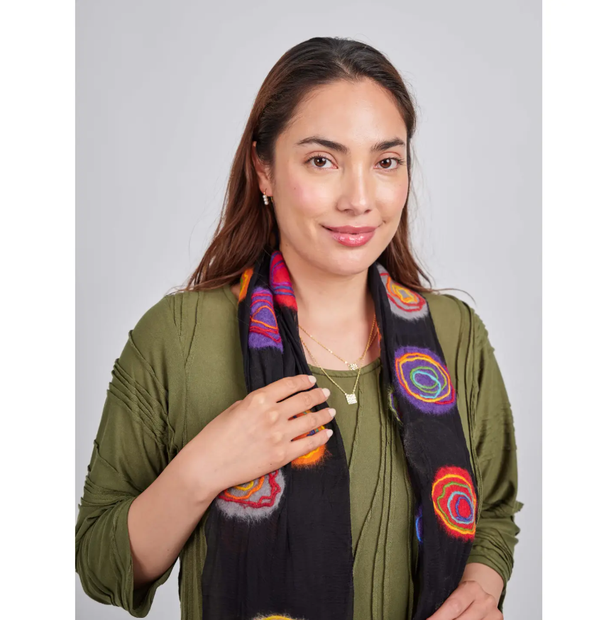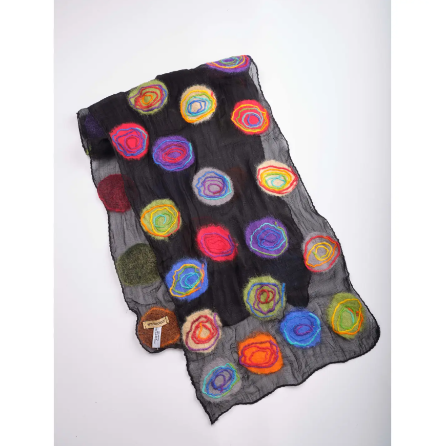 Make a bold statement with our Spiral Felt Silk Scarf, a hand-felted accessory crafted from merino wool and silk. Featuring colorful abstract spirals against a black silk background, this scarf blends artful design with timeless elegance. Lightweight yet warm, it’s the perfect piece to dress up any outfit.