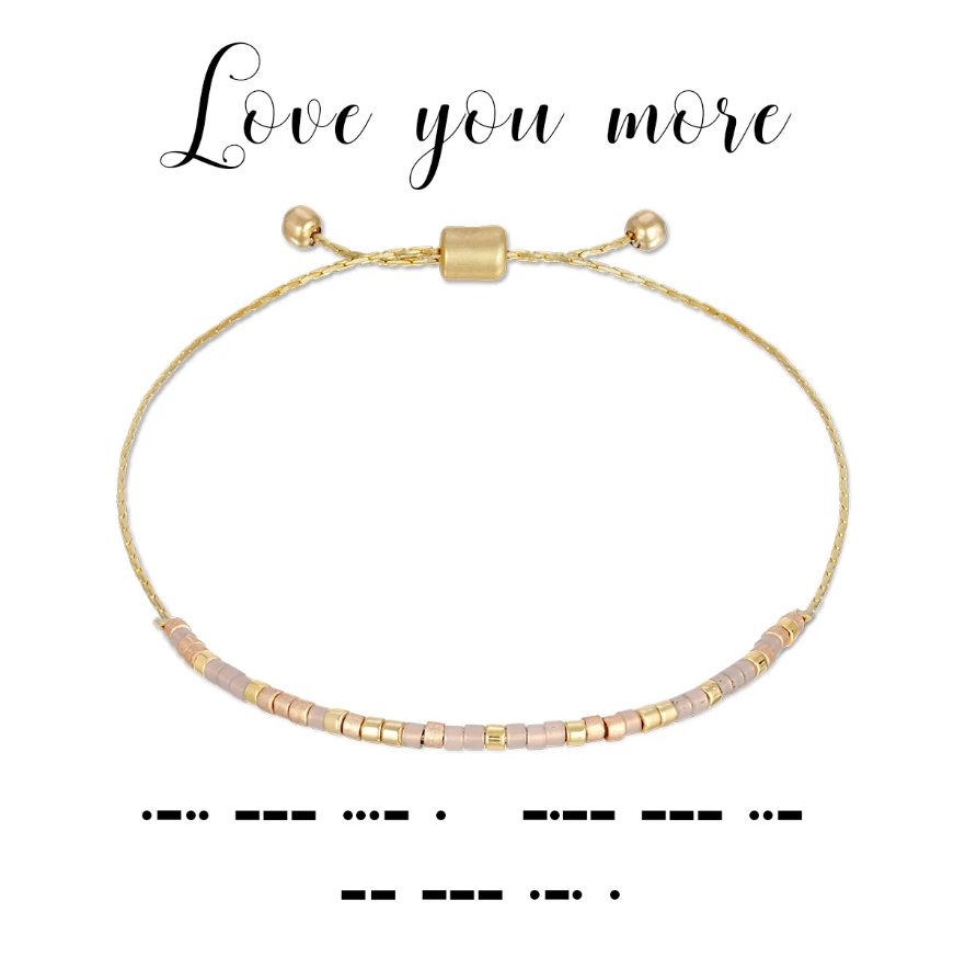 Say it in the sweetest way with "Love You More," a dazzling Morse Code bracelet crafted with peach champagne and blush glass beads — perfect for someone you adore.