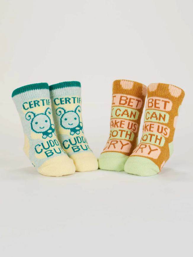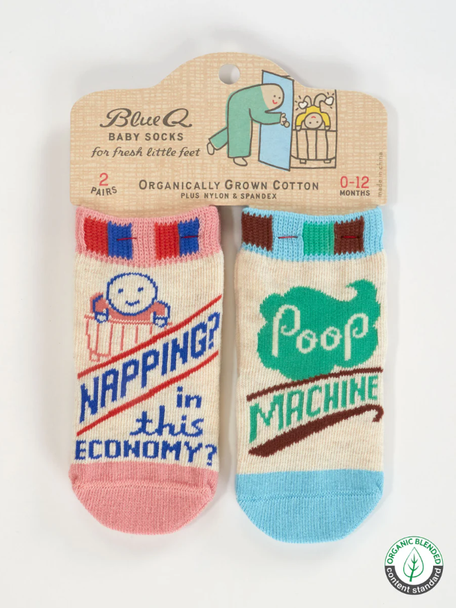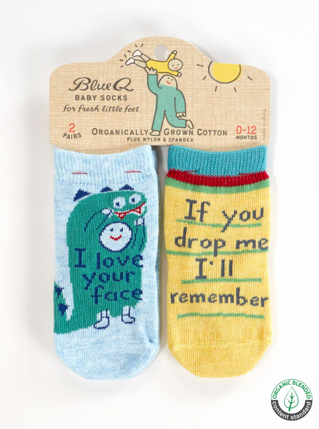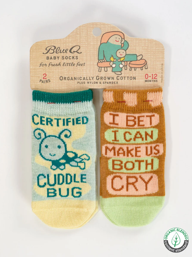 Start ‘em young—with attitude! These Blue Q baby socks are tiny but mighty, featuring hilarious sayings for the sassiest little humans in your life. Woven with soft, OCS Certified Organic Cotton, they’re cozy, comfy, and built for wiggles, naps, and general baby mischief. Each set includes two pairs of socks with clever quotes that are sure to get a giggle.