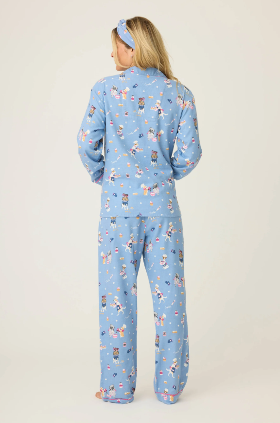 Sleep, lounge, and unwind in the sweetest style with the Baked Woof Love Dog Print 3-Piece Flannel PJ Set from PJ Salvage. Crafted from soft 100% cotton twill flannel, this cozy set includes a classic button-up shirt, relaxed-fit pants, and a matching headband for a perfectly pulled-together look. The playful blue print—featuring adorable pups baking cupcakes, paw prints, and kitchen doodles—adds a cheerful touch to your bedtime routine. A perfect pick for dog lovers, homebodies, and anyone who believes comfort should be cute.