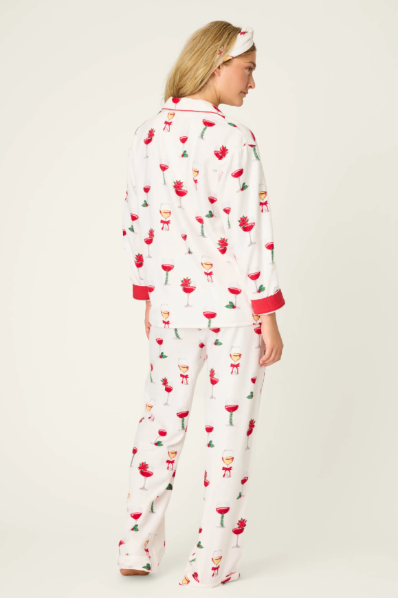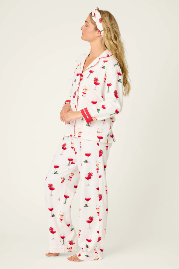 Cheers to the coziest season of all. The Let’s Get Toasty 3-Piece Print Flannel PJ Set from PJ Salvage serves up holiday comfort with a festive twist. Crafted in soft ivory cotton flannel, this plus-size pajama set features a playful print of wine glasses adorned with poinsettias, sprigs of holly, and bright holiday bows. The classic button-down top is trimmed with red piping for a polished finish and pairs effortlessly with the relaxed drawstring pants. A matching headband completes the look, making this set equal parts comfortable, coordinated, and giftable. Ideal for holiday happy hours, wrapping marathons, and fireside lounging.