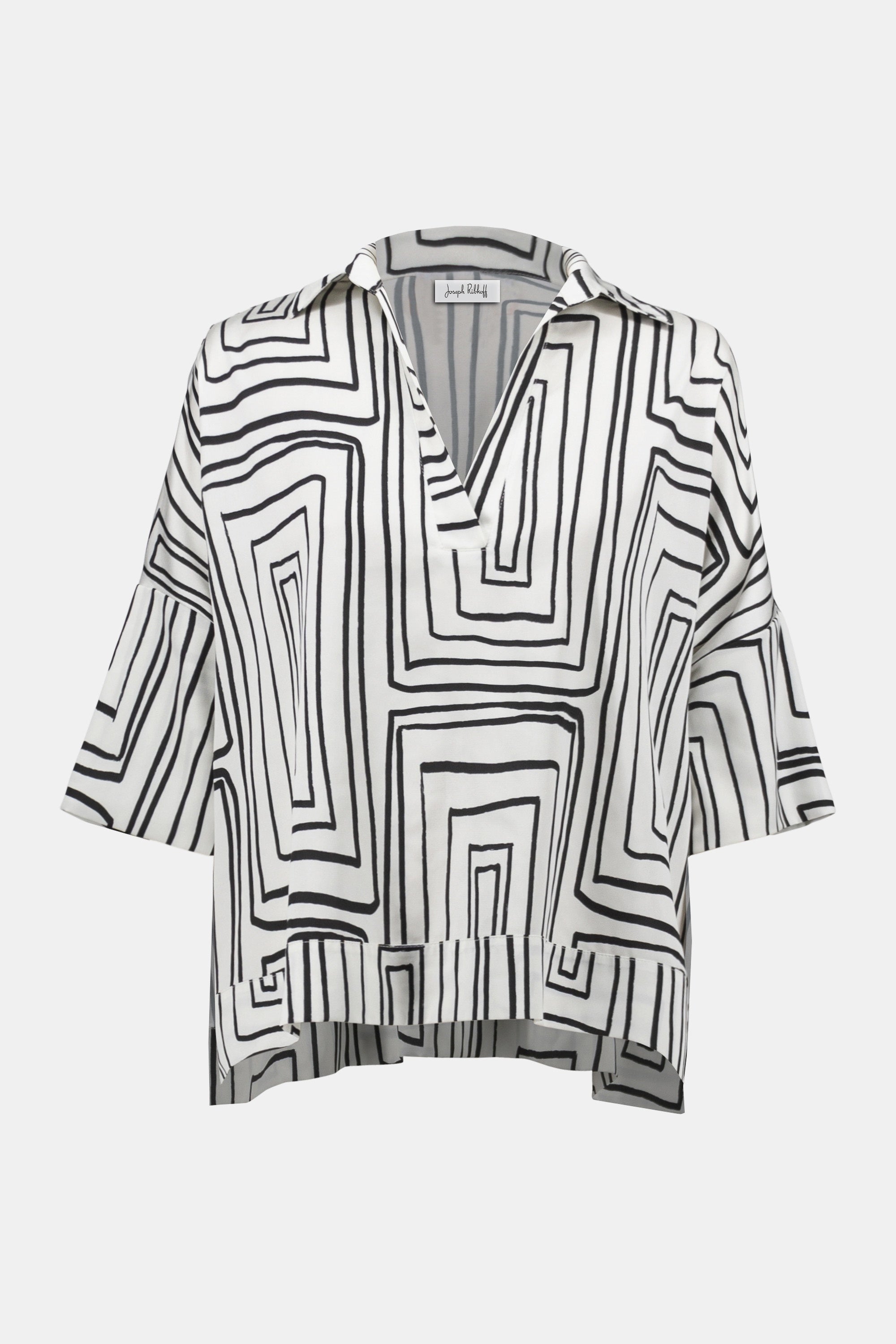 Turn heads in this Satin Geometric Print Boxy Top from Joseph Ribkoff—a true statement piece that blends modern artistry with timeless structure. Crafted in silky satin with a bold geometric print, this top features a relaxed, boxy silhouette that’s both fashion-forward and easy to wear.