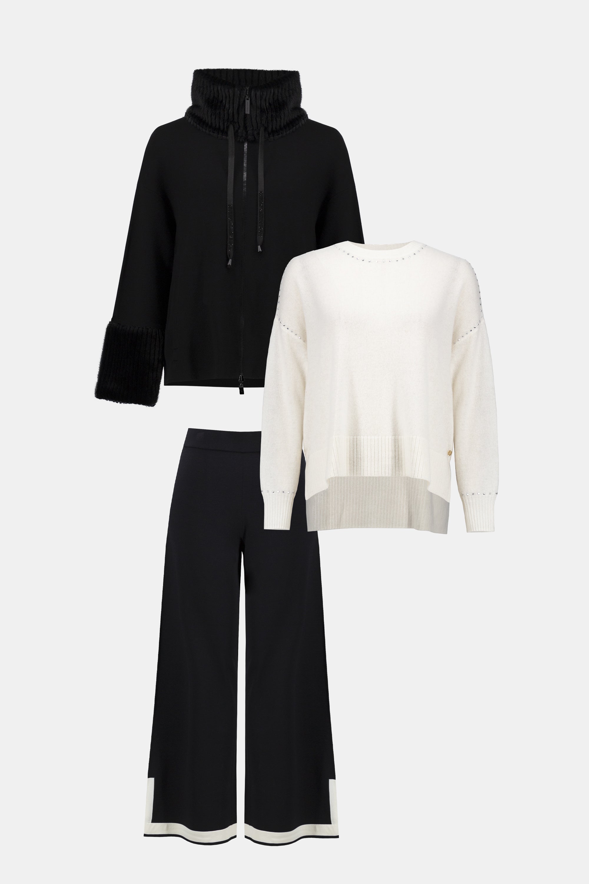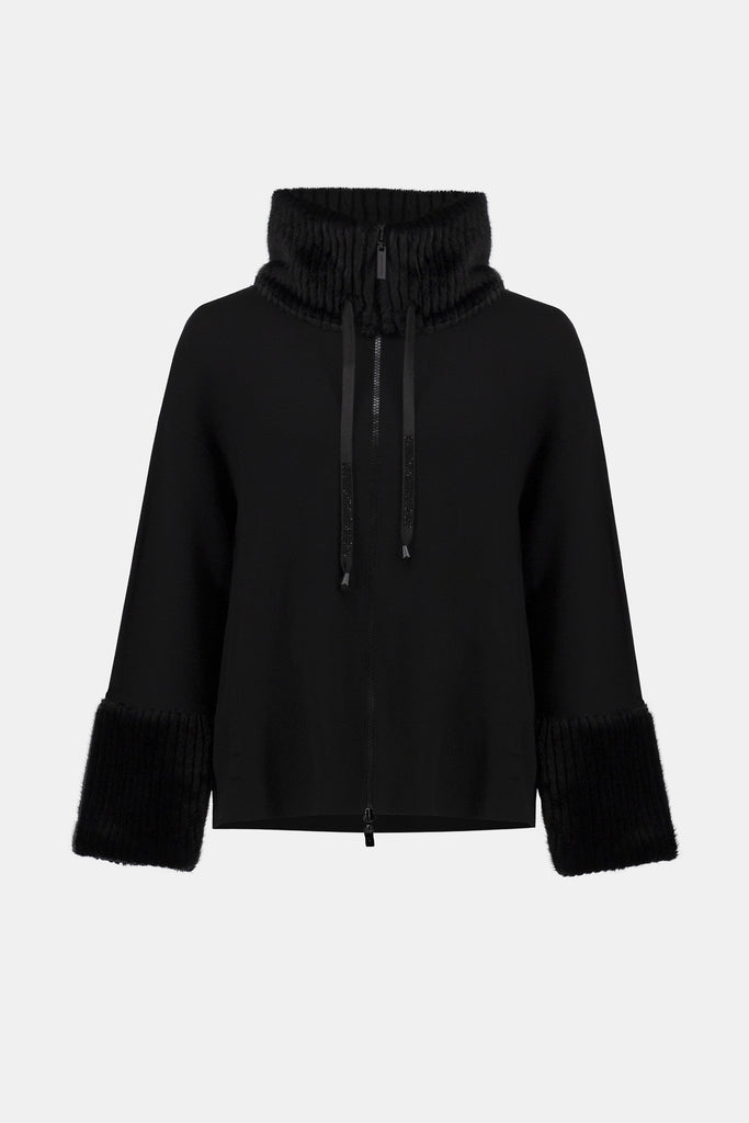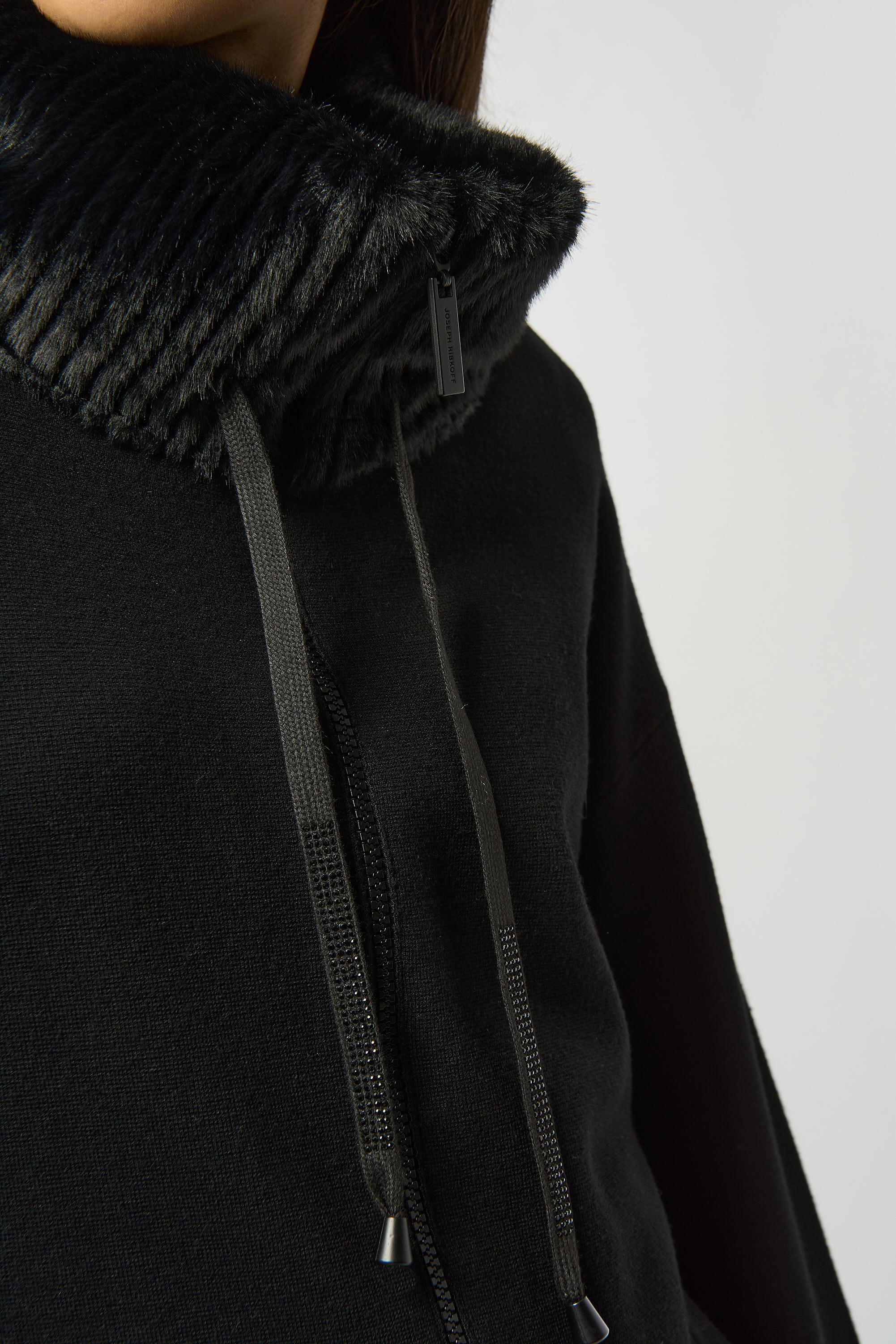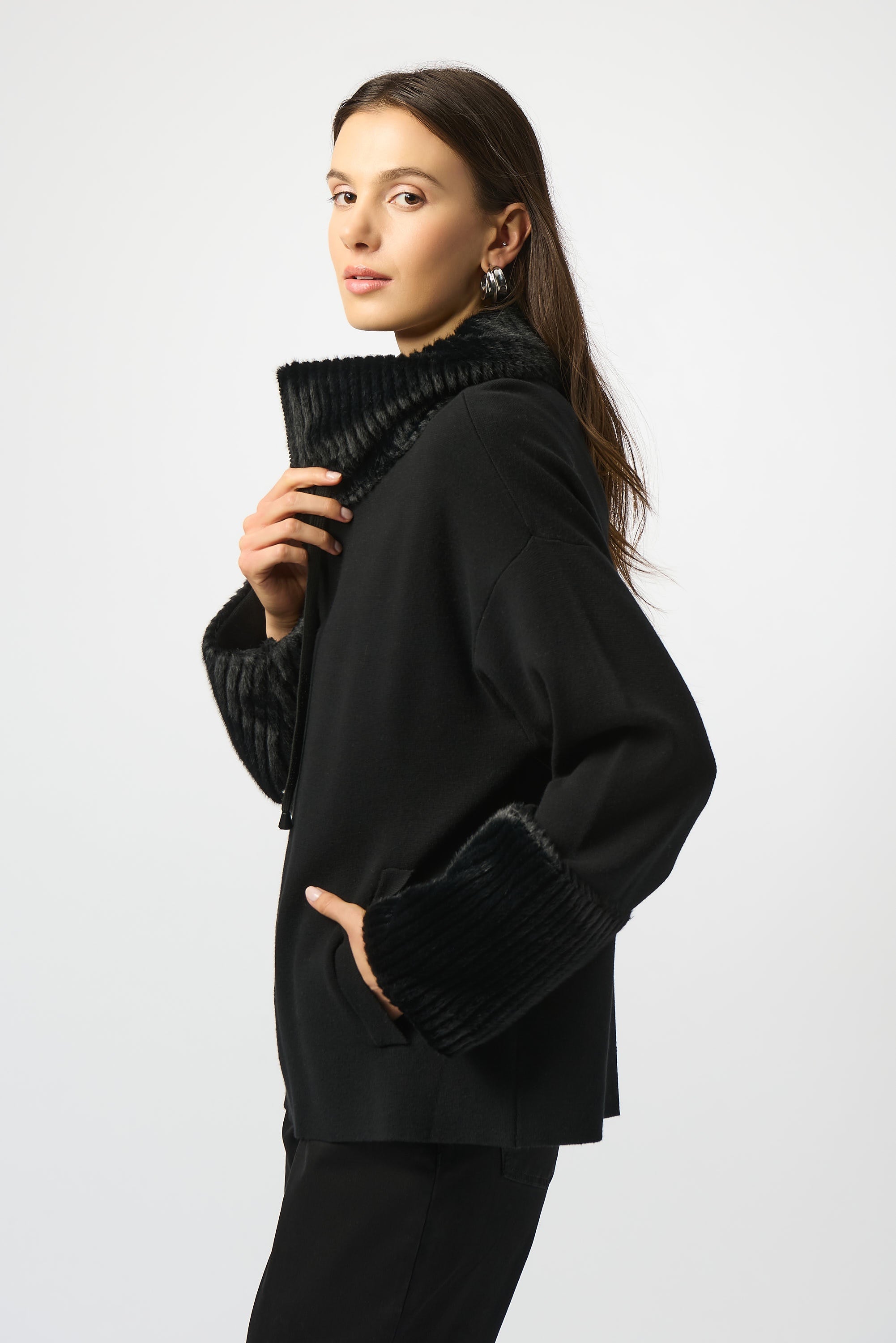 Wrap yourself in elegance with the Joseph Ribkoff Sweater Knit Coat with Fur Trim. Crafted from a rich, cozy knit blend, this unlined coat features a plush faux fur trim and a polished mock collar for warmth and sophistication. The long straight sleeves and front zipper closure offer clean, modern lines, while the rhinestone-accented drawstrings add a hint of sparkle and personality. Whether you're heading to dinner or dashing through town, this coat is your statement piece of the season.