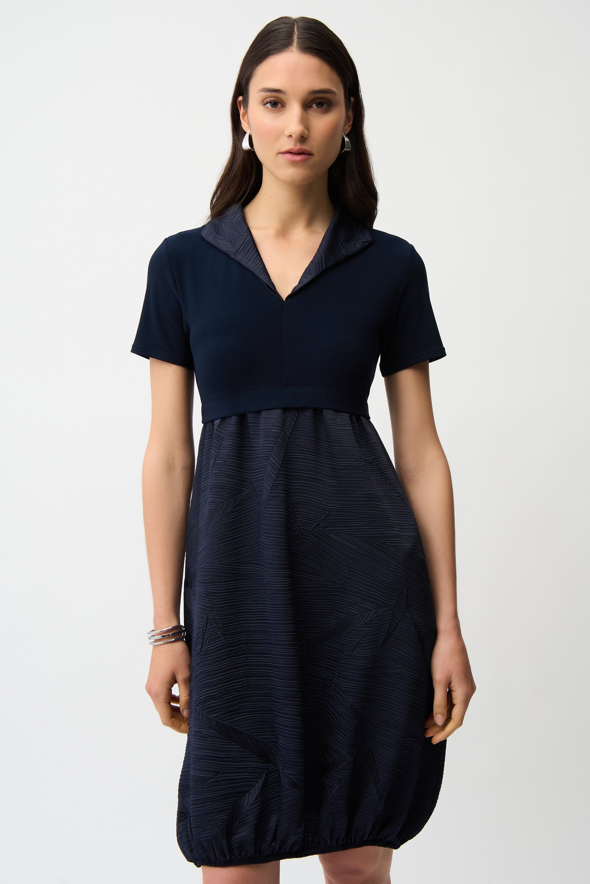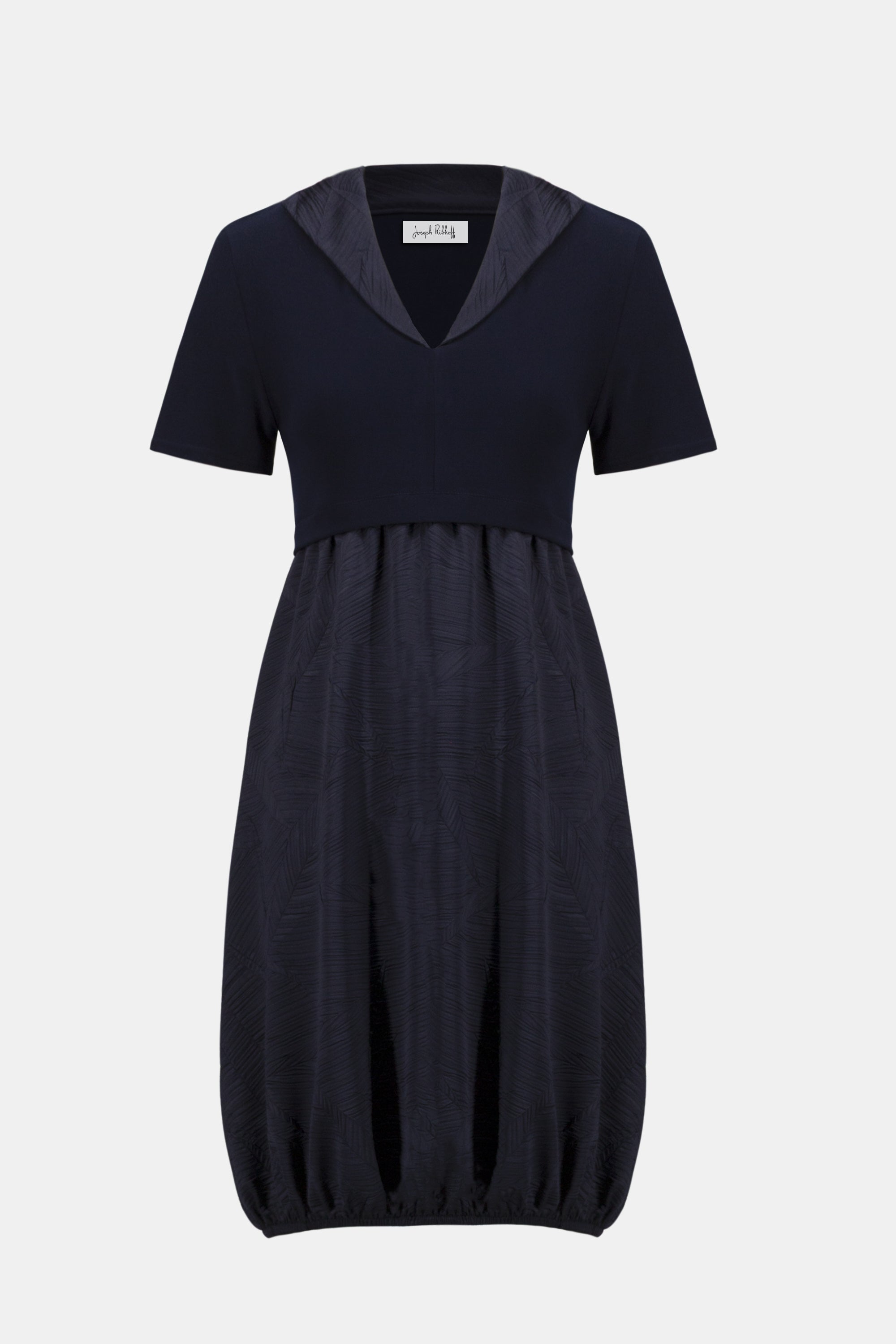 Modern texture meets effortless sophistication in this cocoon dress from Joseph Ribkoff. Designed at a flattering knee length, this statement piece blends pleated satin with smooth silky knit for dimensional elegance and soft movement.
