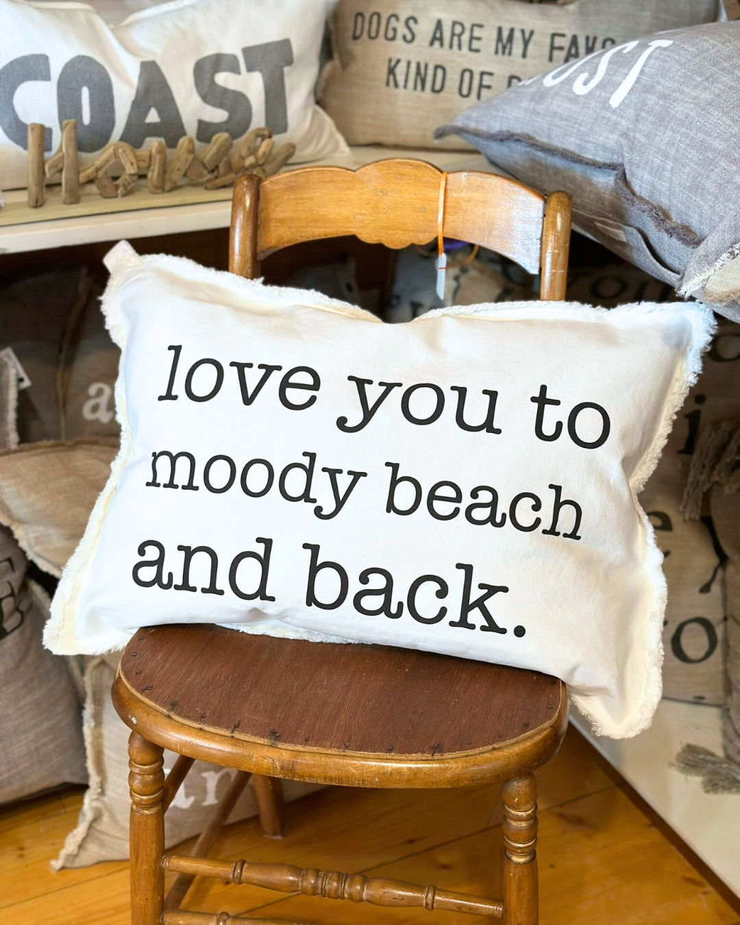 Send a sweet message from the coast with our “Love You To Moody Beach & Back” Lumbar Pillow. Measuring 18" x 25", this oversized lumbar pillow brings a heartfelt touch to any room—whether it’s styled on a porch bench, cottage bed, or cozy reading chair.