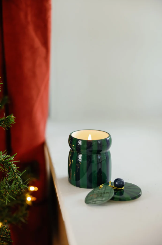 Bring the scent of the season indoors with the Balsam Fir – Green Navy Striped Candle Jar by Paddywax. This hand-painted ceramic candle features a fresh, woodsy blend of balsam, pine, and fir—perfect for creating a cozy holiday atmosphere. Topped with a functional lid and finished in green and navy stripes, it’s as beautiful as it is fragrant. Once the candle has finished burning, the reusable jar becomes a charming storage container or decorative accent for your winter décor.