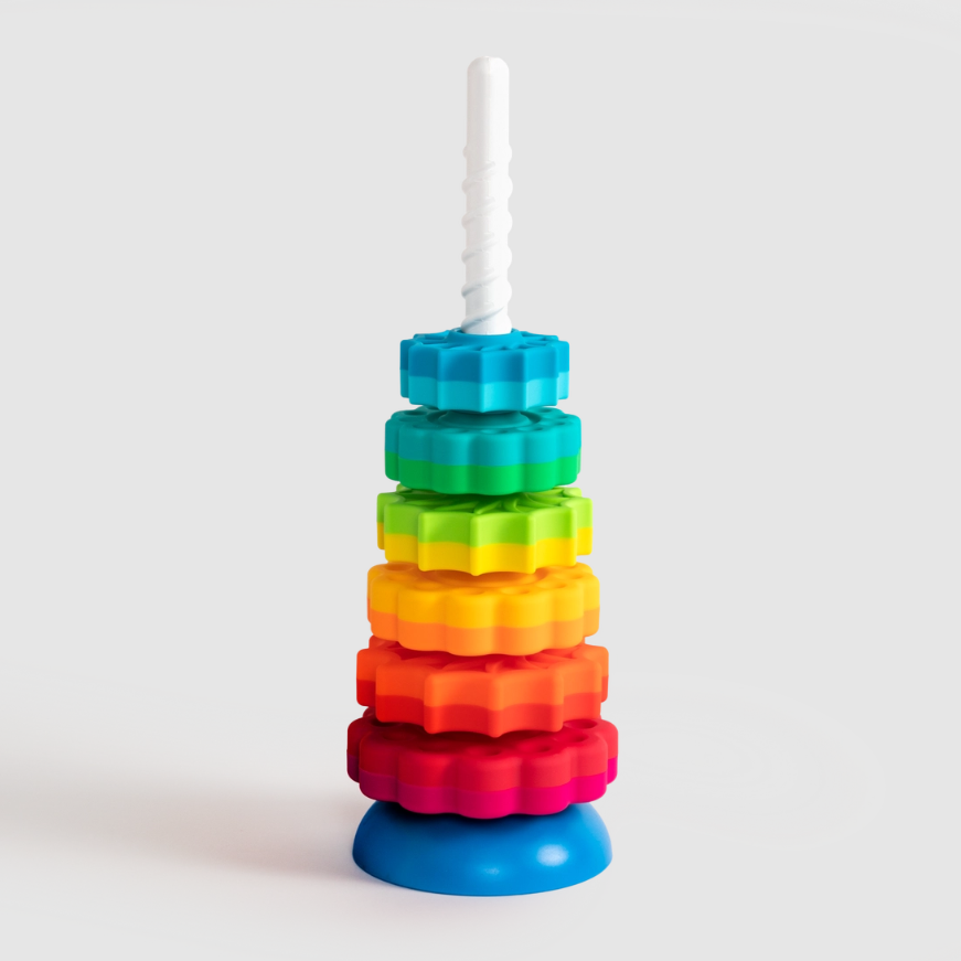 Drop the vibrant discs onto the threaded corkscrew pole and go ooooh as they spin fast and smooth to settle onto the reversible base.