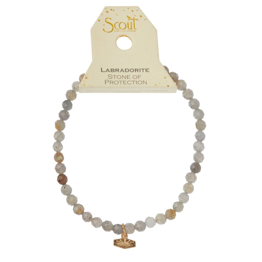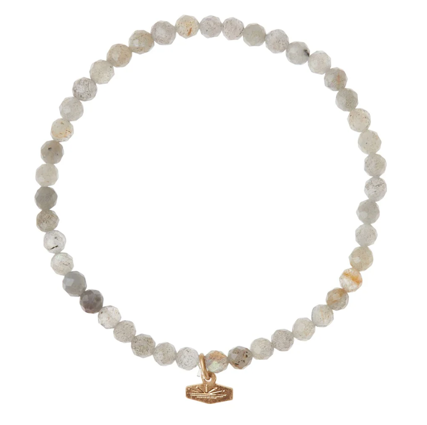 Add a subtle sparkle to your wrist with the Mini Faceted Stone Stacking Bracelet in Labradorite and Gold. Featuring 4mm faceted semi-precious labradorite beads, this bracelet brings a refined touch of shimmer and meaning. Labradorite is known as the Stone of Protection, making this piece both beautiful and purposeful.