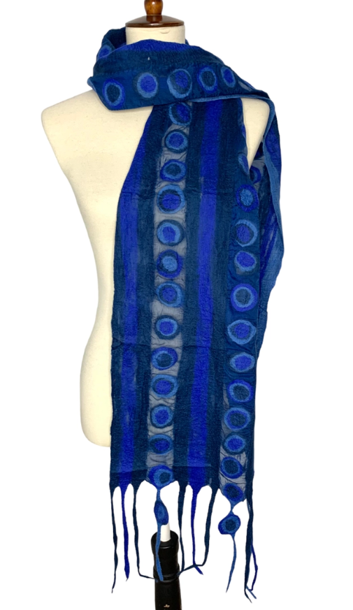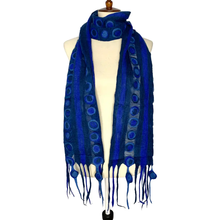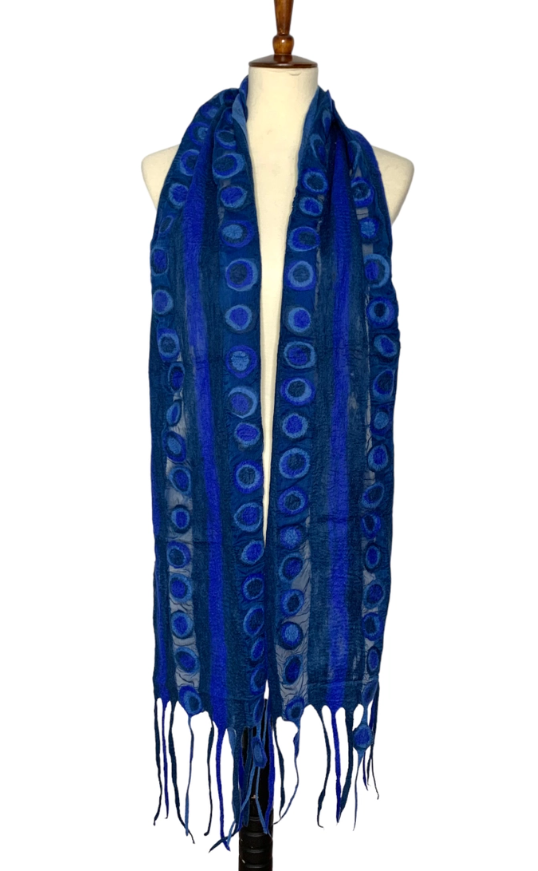 Soft texture meets artistic detail in the Stripes & Stones Scarf – Blue by Pomegranate Moon. Lined merino wool “stones” are carefully placed over a blue striped chiffon background, creating a layered look that feels both modern and timeless. Lightweight and airy with just the right amount of warmth, this scarf is easy to wear year-round.