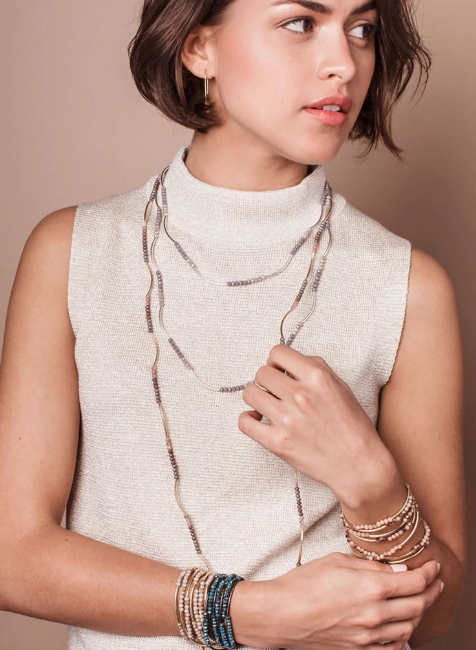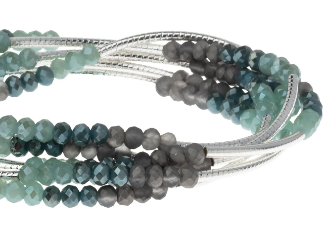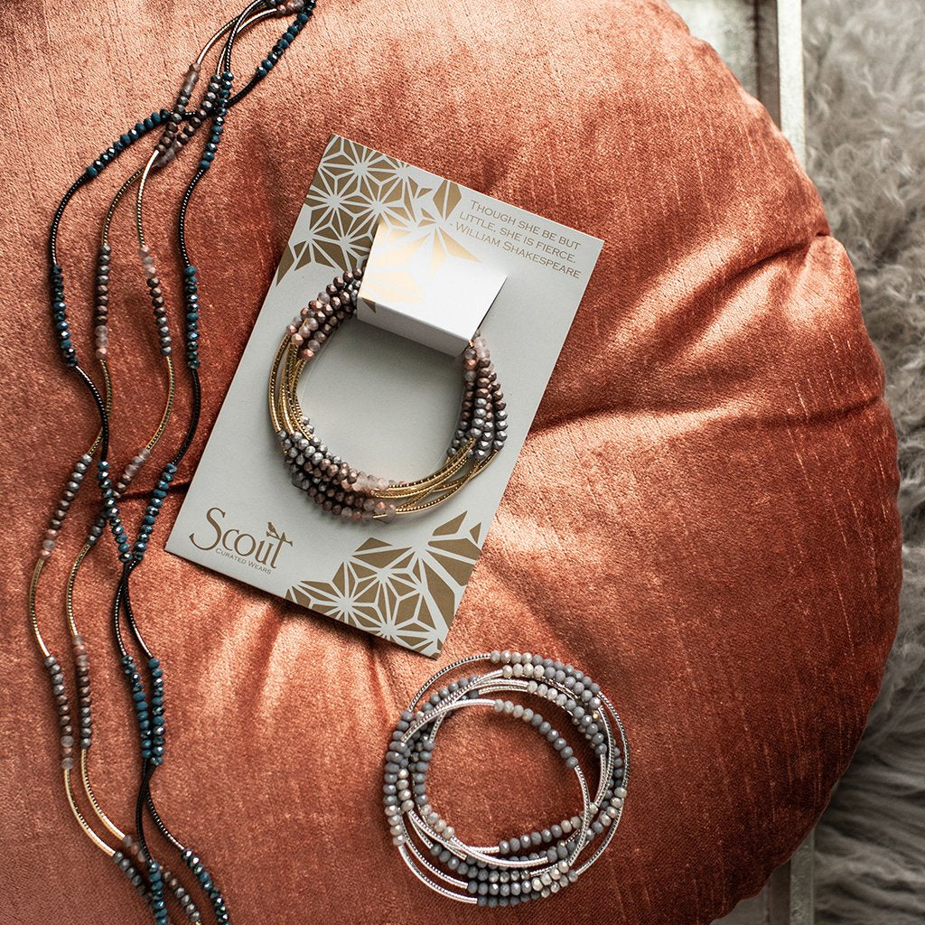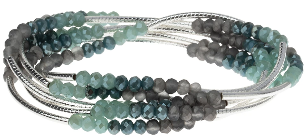 The Scout Wrap is made with crystal beads and etched metal findings. It can be worn wrapped 6-7 times for a bracelet and 1-3 times for a necklace. Displayed on beautiful cards and personalized with inspiring quotes they make a great gift!