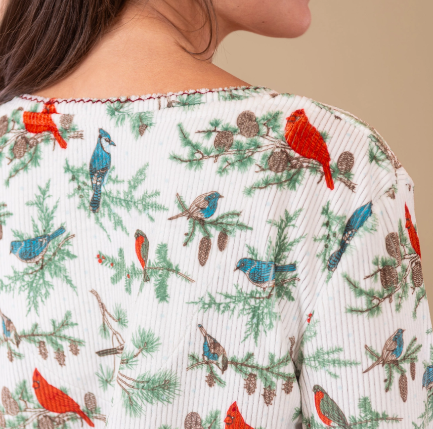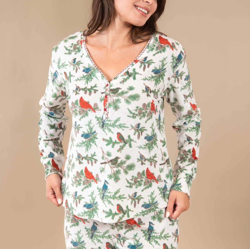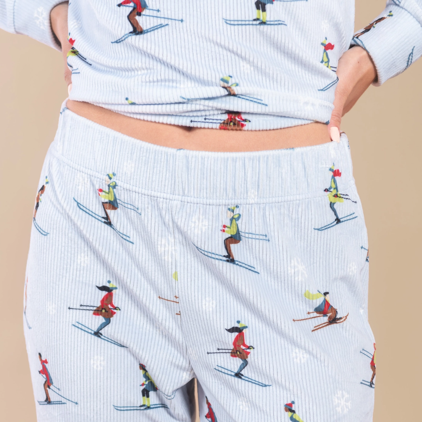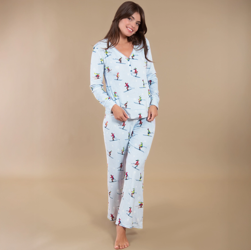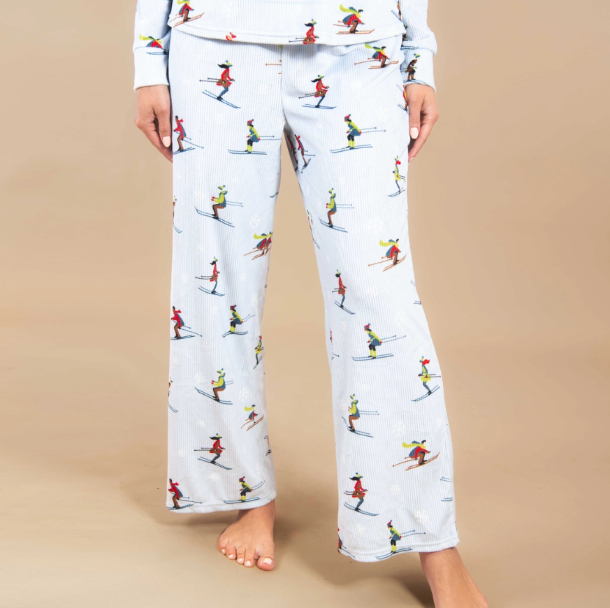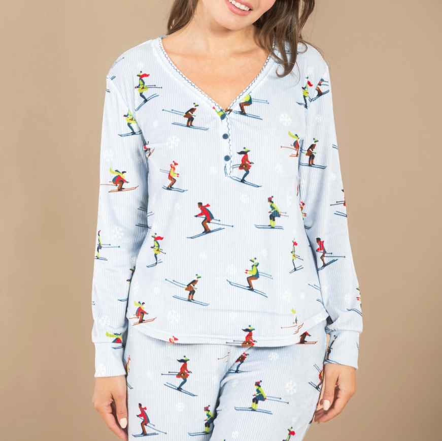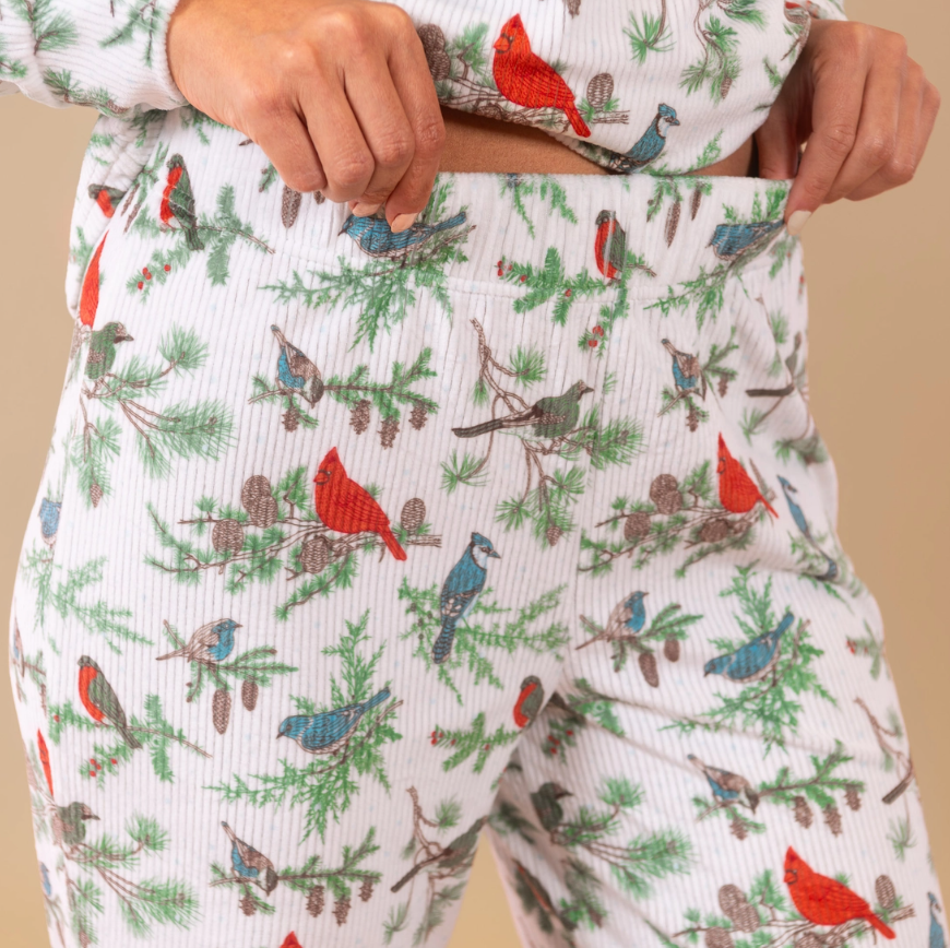 Whether you’re curling up fireside or dreaming of the slopes, the Luxe Lounge Set by Amanda Blu wraps you in warmth and whimsy. Available in two charming winter patterns — Winter Birds, featuring cardinals and blue jays perched on snow-covered pines, and It’s Snow Time Ski, showcasing playful ski motifs — each set combines ultra-soft chenille fabric with relaxed luxury.