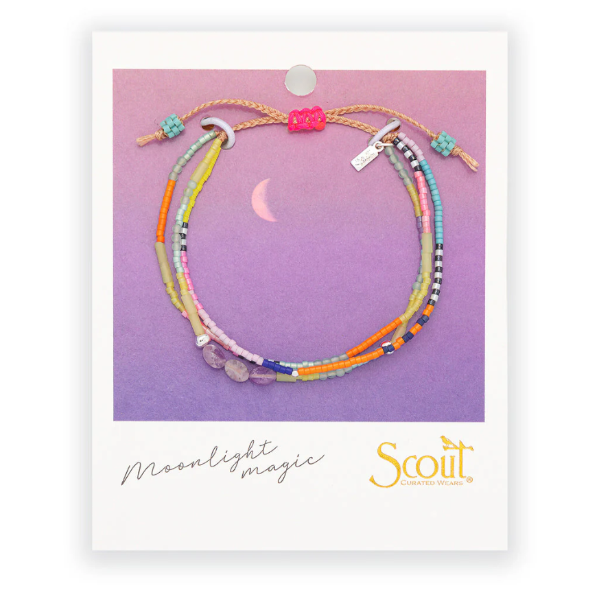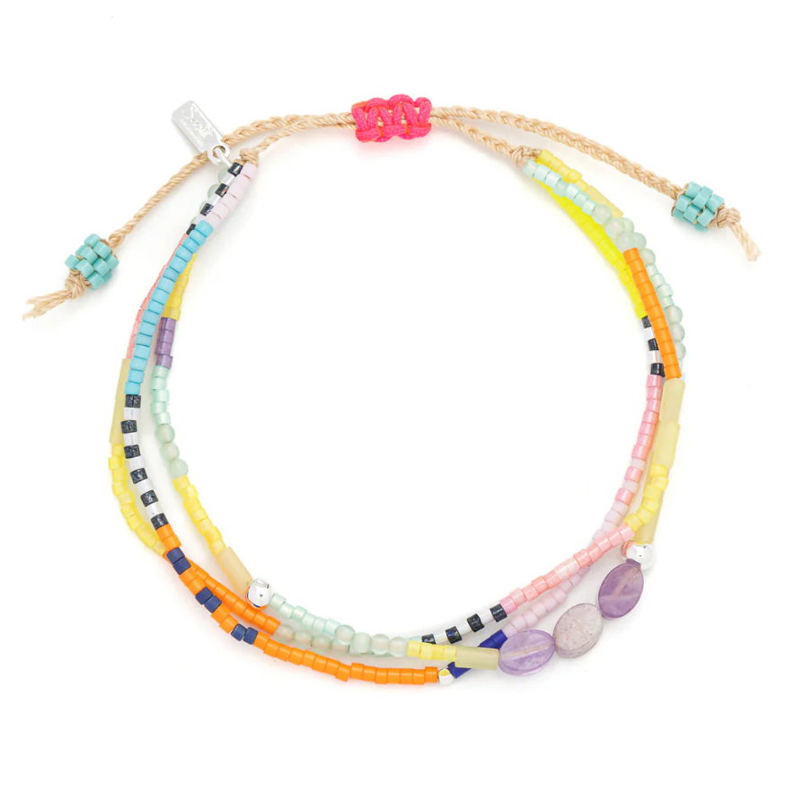 The semi-precious stone and its meaning are highlighted on the back on each card and connect to the photograph on the front of the card. Each playful stacking bracelet incorporates semi-precious stones along with Japanese glass Miyuki beads.