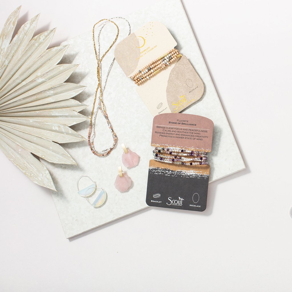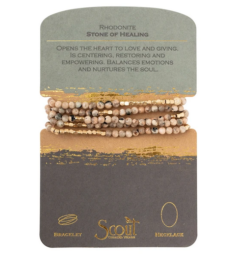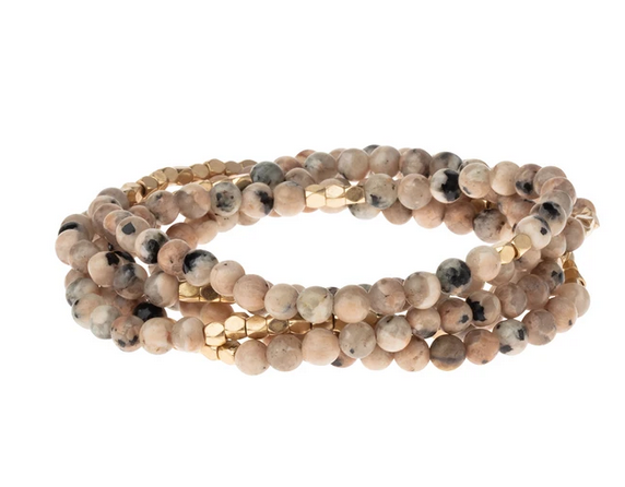Tap into the energies of the earth.  Semi precious gemstones adorn wrist & neckline. Effortlessly converts from bracelet to necklace.  Can be wrapped 4-5 times as a bracelet and 1-2 times as a necklace.