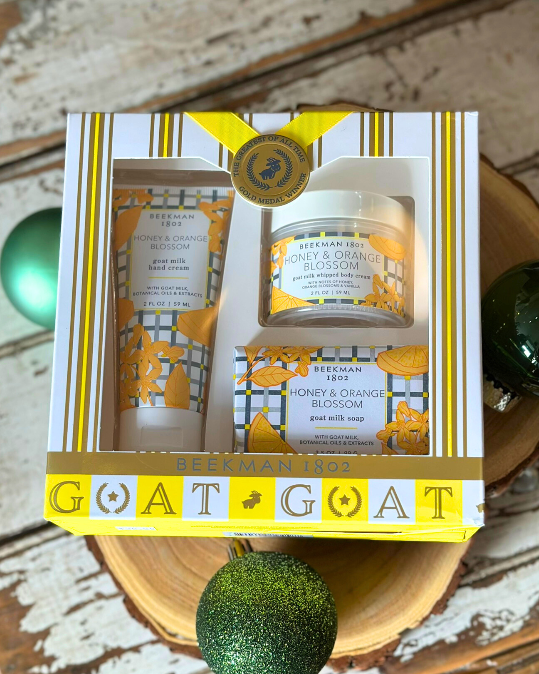 Each set includes a Whipped Body Cream (2oz), Hand Lotion (2oz), and Bar Soap (3.2oz) — all enriched with Beekman’s signature goat milk to deeply hydrate and replenish the skin. It’s the perfect self-care set for gifting or a sweet way to pamper yourself.