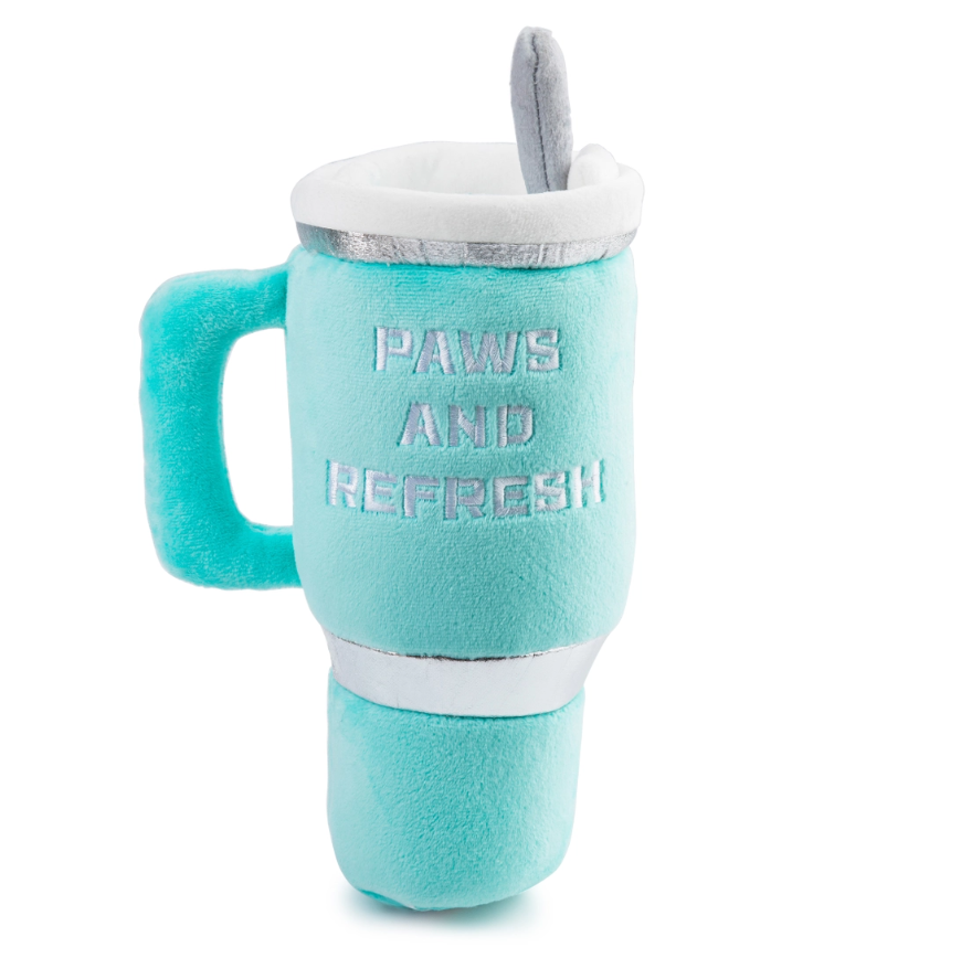 Quench your pup’s thirst for fun with the Snuggly Cup Plush Dog Toy—a playful take on everyone’s favorite iconic tumbler! This teal plush toy features the cheeky phrase “Paws and Refresh” on the back, making it the perfect blend of cozy and cool. Whether your dog loves to fetch, cuddle, or squeak, this toy brings the perfect splash of personality to their playtime.