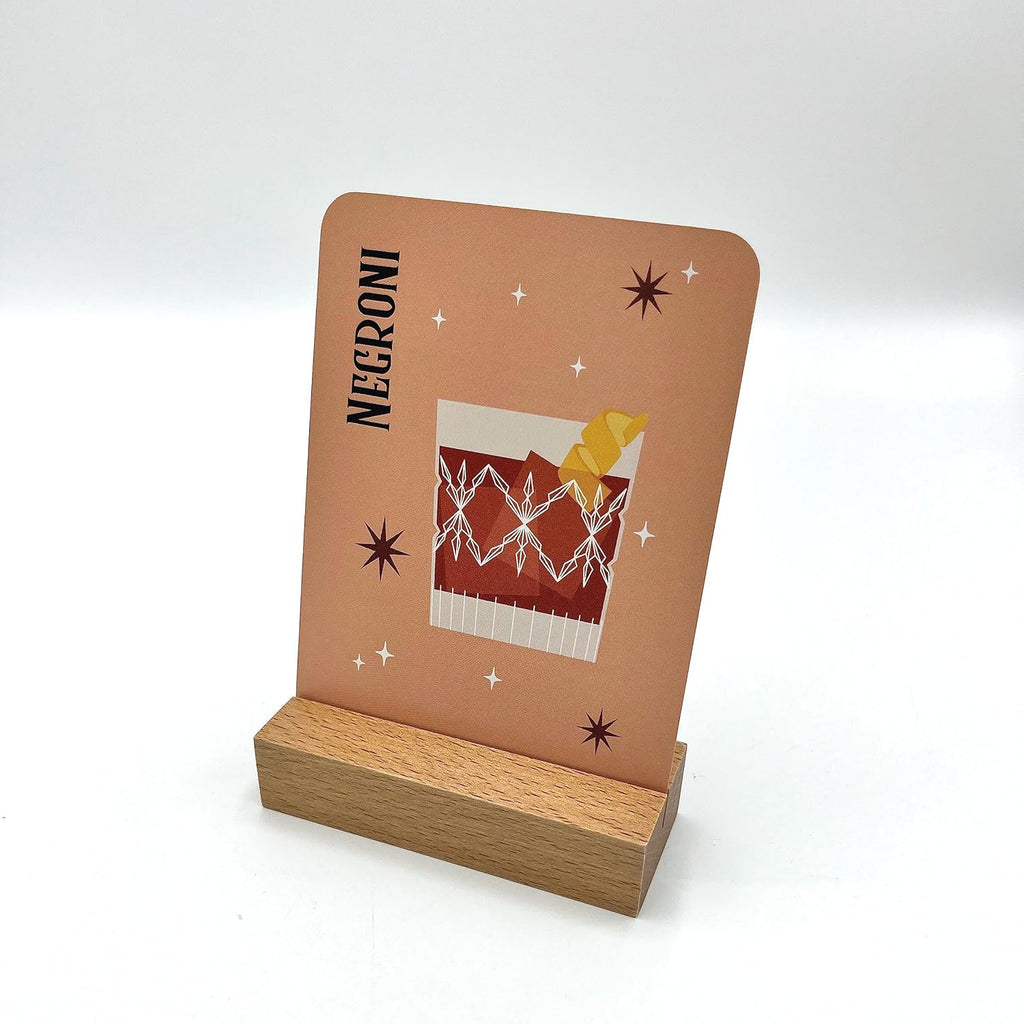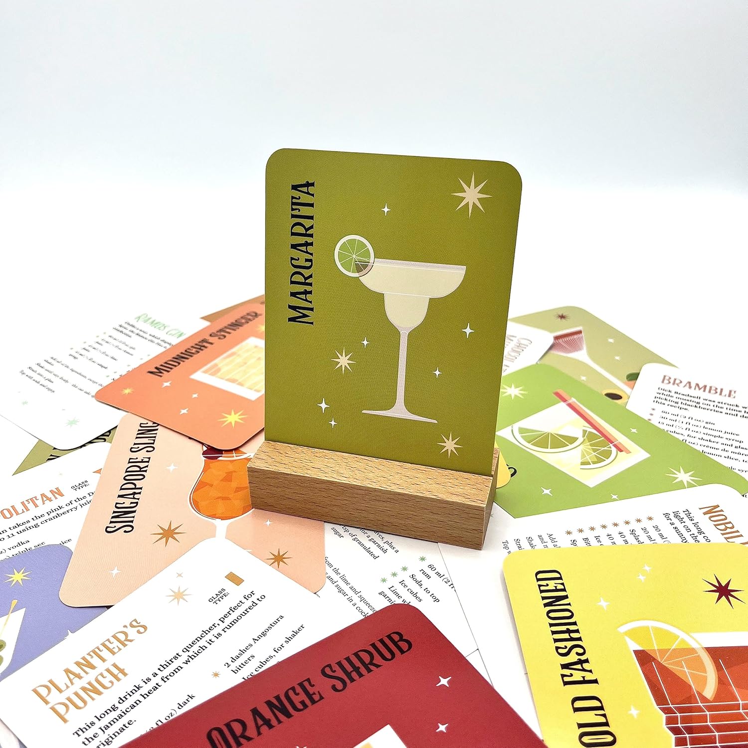 This box contains 52 cards of delicious cocktail recipes with beautiful bespoke illustrations, plus a wooden stand for easy display