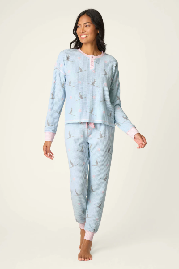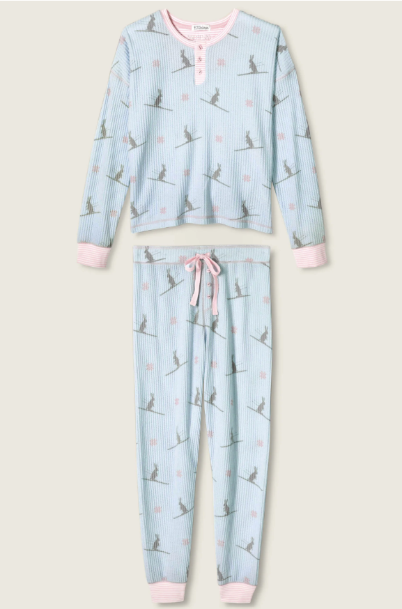 Meet the coziest way to channel your inner snow bunny. The Ski Jammie Classics Ski Bunny PJ Set from PJ Salvage is a brushed thermal dream—soft, warm, and ready for every wintry moment. This pale-blue set is sprinkled with playful skiing bunnies swooshing across the slopes, giving it a lighthearted, winter-inspired feel. The long-sleeve henley top features icy-blue trim for a crisp finish, while the jogger-style pants include cuffed hems and a white ribbon tie for a touch of charm. Perfect for après-ski lounging, gift giving, and cocoa-filled nights at home.