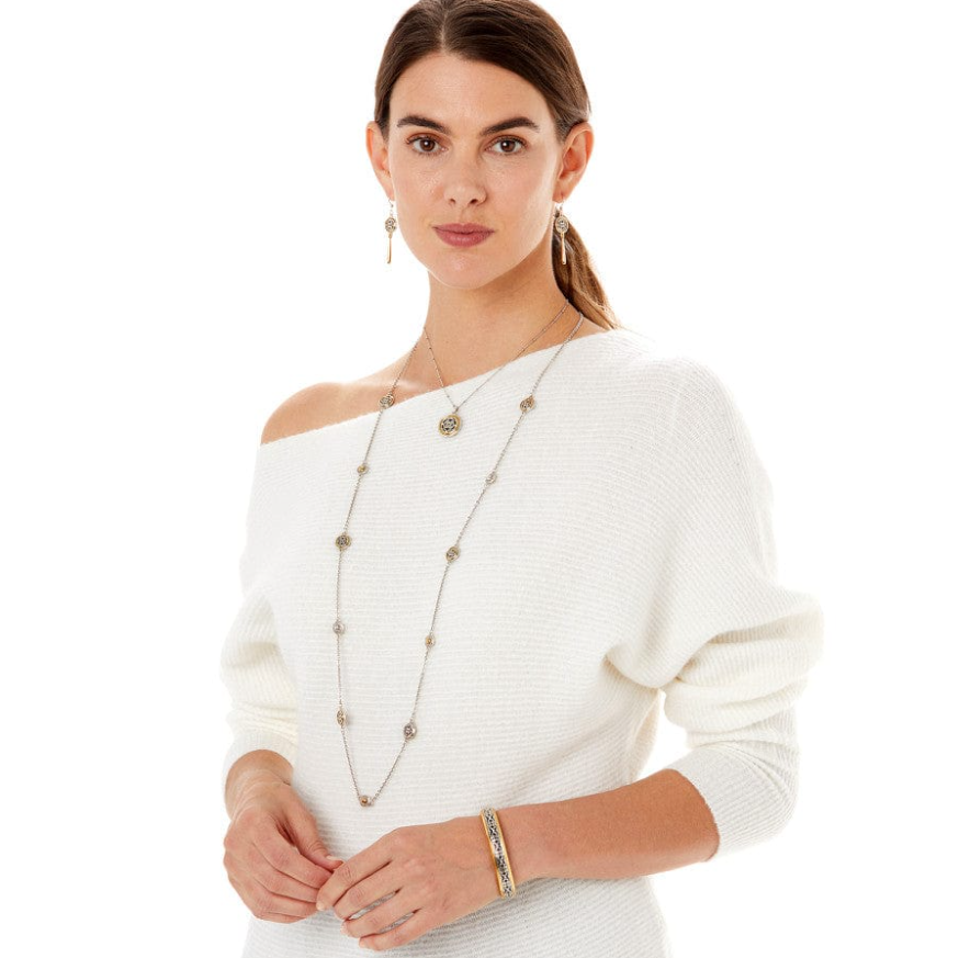 New to the Intrigue collection, with petite features, this pendant necklace reverses from an all silver to a two-tone, silver and gold, pierced design.