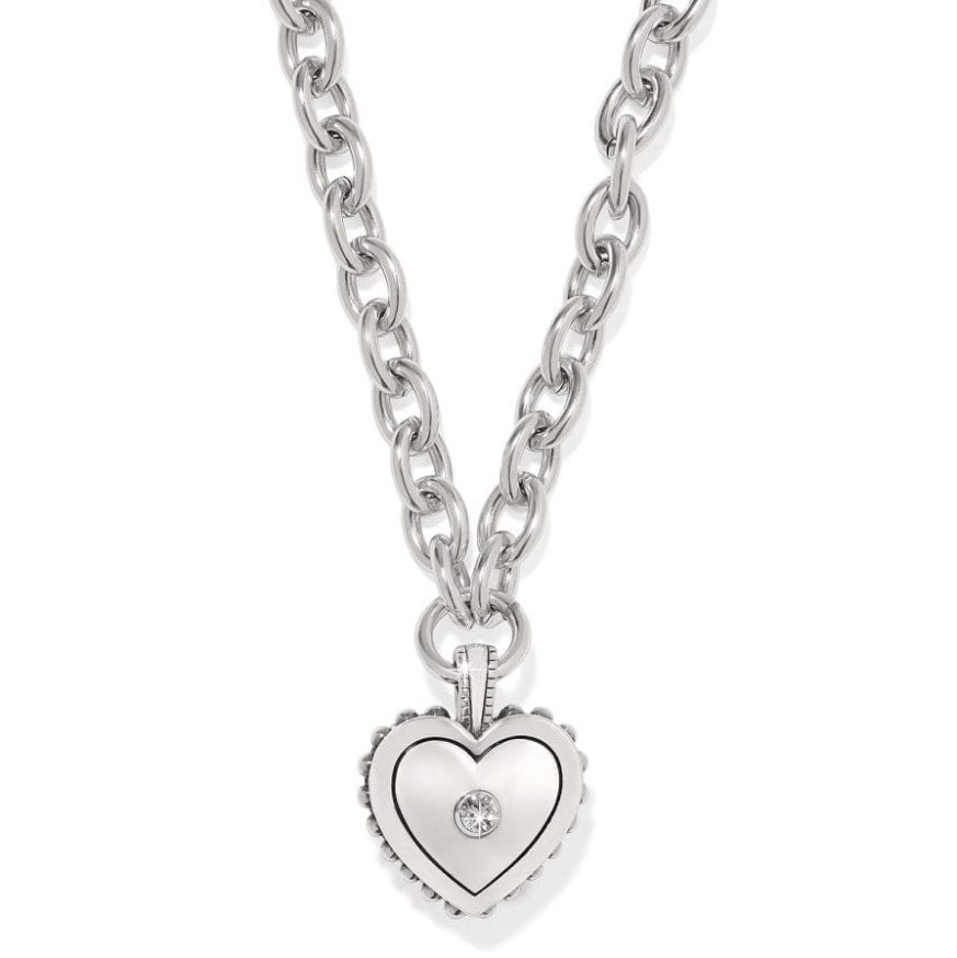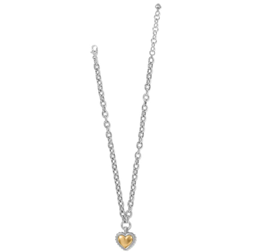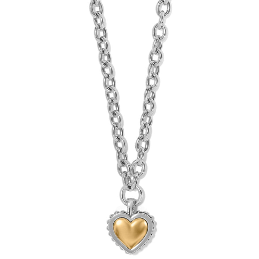 The Pretty Tough Bold Two Tone Necklace by Brighton combines urban sophistication with artisanal charm. Featuring a heart-inspired pendant with domed beading and clean, modern lines, this two-tone necklace is both edgy and classic. Its mixed metals make layering effortless—pair with silver, gold, or mixed-metal pieces for a curated, versatile look. Finished with a lobster-claw closure, this necklace adjusts from 16" to 18", making it perfect for day-to-night styling.