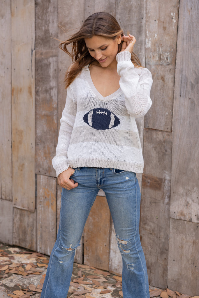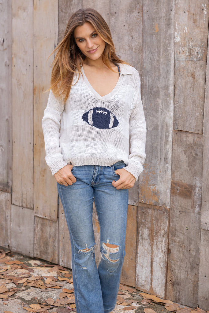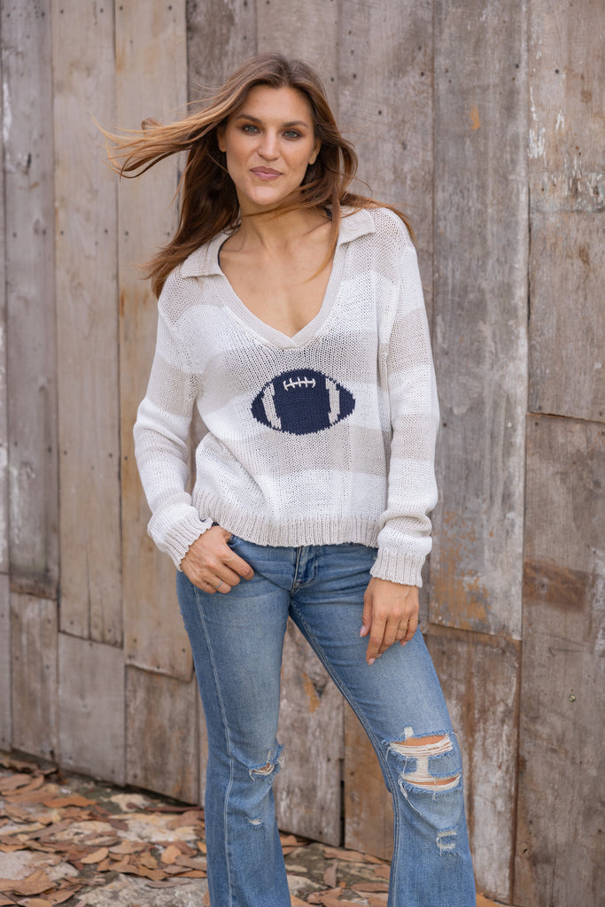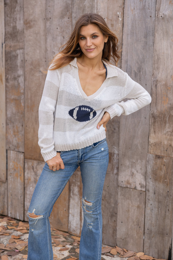 Football season is fast approaching—are you ready? Show up in style with the Football Striped Cotton V Sweater by Wooden Ships. This relaxed-fit sweater features varsity-inspired stripes, a playful football graphic on the front, and a shirt collar neckline for a sporty-chic twist. Knit from breathable cotton yarn, it’s lightweight yet cozy—perfect for tailgates, watch parties, and crisp fall weekends. Whether you’re cheering from the stands or the couch, this boxy silhouette keeps you comfy and cute from kickoff to touchdown.