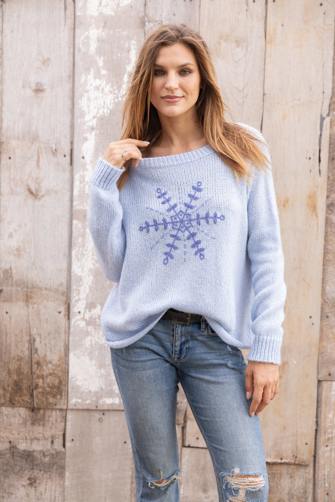 Embrace the beauty of winter in the Clara Embroidered Crew Sweater by Wooden Ships. This cozy knit features a classic crew neckline, relaxed fit, and subtle rolled hem for an easy, laid-back look. A delicately embroidered snowflake adds a festive touch, making it the perfect piece to celebrate the season in style.