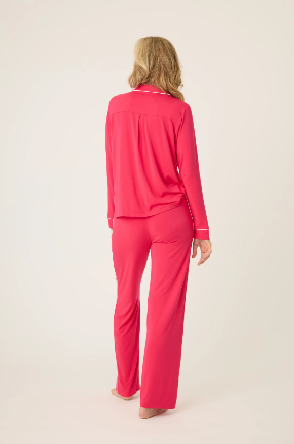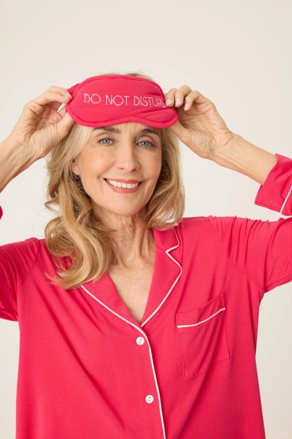 Brighten up your loungewear collection with this bold ruby red collared PJ top and matching tie-waist pants, complete with an embroidered 'do no disturb eye mask' sleep eye mask for added luxury. The vibrant color and comfortable fit make this set a standout for lounging or relaxing in style.