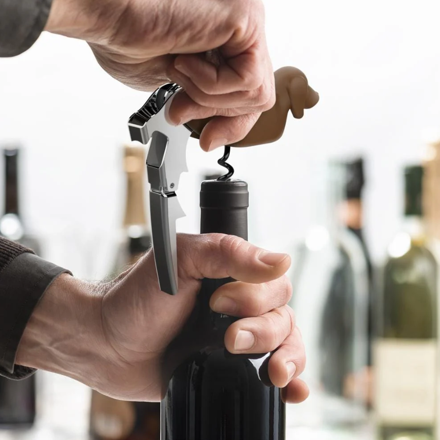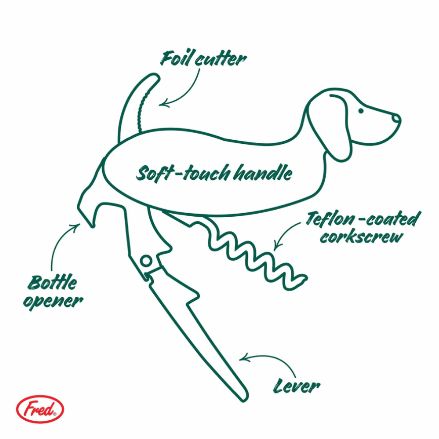 Had a "ruff" day? Let WINER DOG come out to play. This delightful dachshund sits on your table until he's called on to perform some tricks. Hidden inside its soft-touch ABS handle is a trio of stainless steel tools, including a double-hinged corkscrew, a bottle opener, and a serrated foil cutter. He's a bottle's best friend.