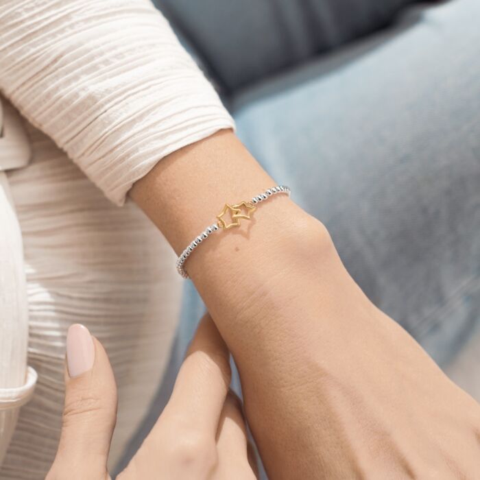 Our A Little 'Always My Sister, Forever My Friend' Bracelet features a captivating design that will dazzle with every movement. Featuring a stretch-bead style and a beautiful silver-plated charm, wrapped around one of our stylized cards and framed by a sweet poem. It's oh-so special.