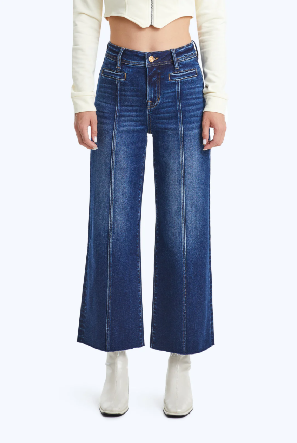 Meet your new everyday denim—effortless, flattering, and perfectly on trend. These high-rise wide leg jeans from Bayeas are crafted from comfortable stretch denim and designed with a modern cropped ankle length. A raw, frayed hem adds a laid-back edge, while the front seam and unique pocket detailing give this pair a clean, elevated finish. Easy to dress up or down, these jeans are a versatile staple for year-round wear.