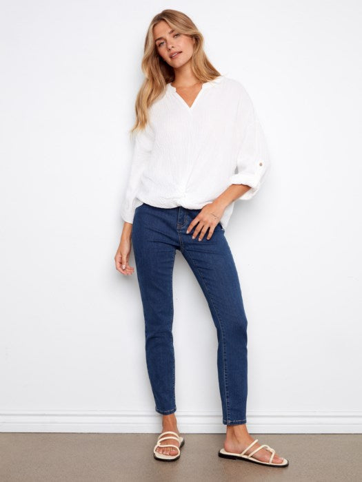 Fresh, lightweight, and effortlessly stylish, the Bubble Cotton Blouse with Front Twist by Charlie B is the kind of top that instantly elevates everyday outfits. Made from 100% breathable cotton, this blouse offers a soft, airy feel that’s perfect for warm days and easy layering.