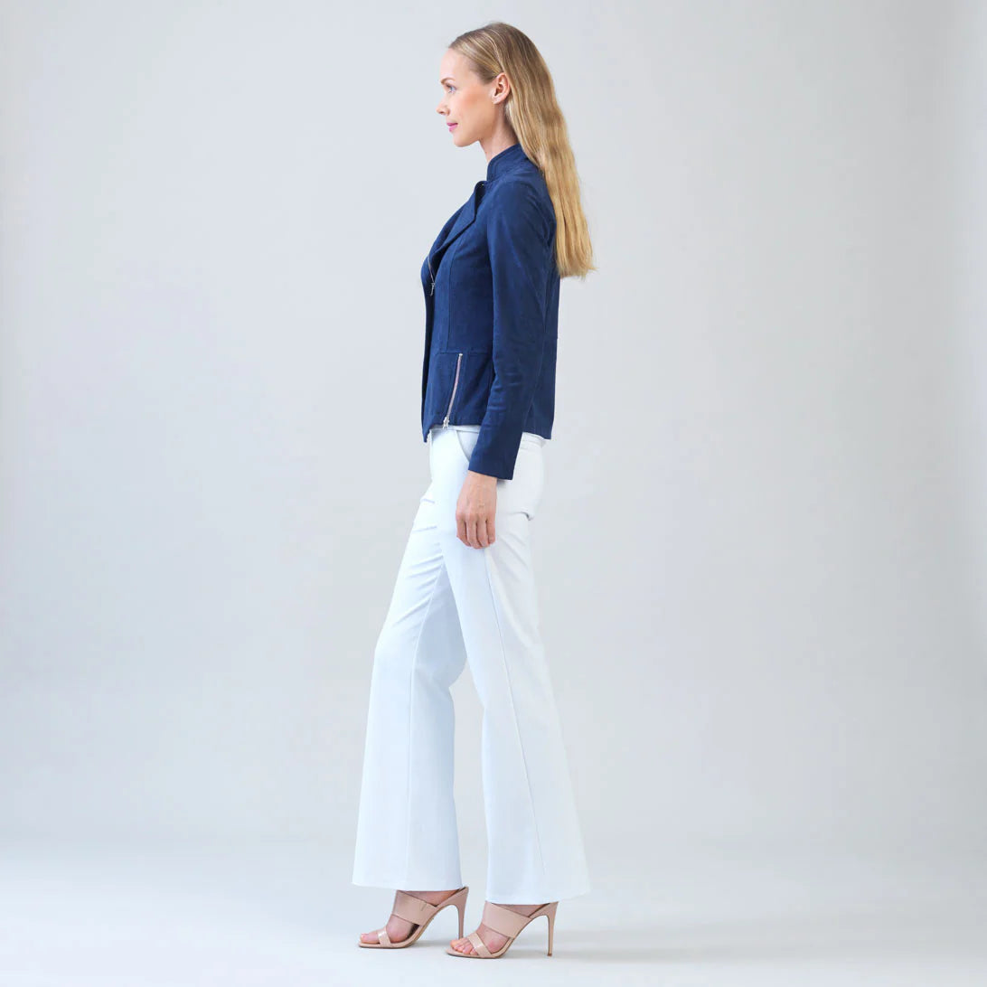 Faux pocket zipper slits and detailed front and backstitching add subtle structure and polish. Crafted from an innovative lightweight suede knit with stretch, this jacket offers the luxe look of suede with a softer, more fluid feel. Unlike traditional suede, it drapes effortlessly, moves comfortably, and never feels stiff or heavy.