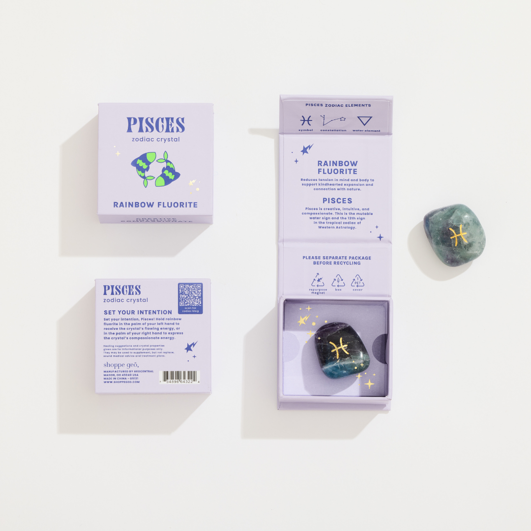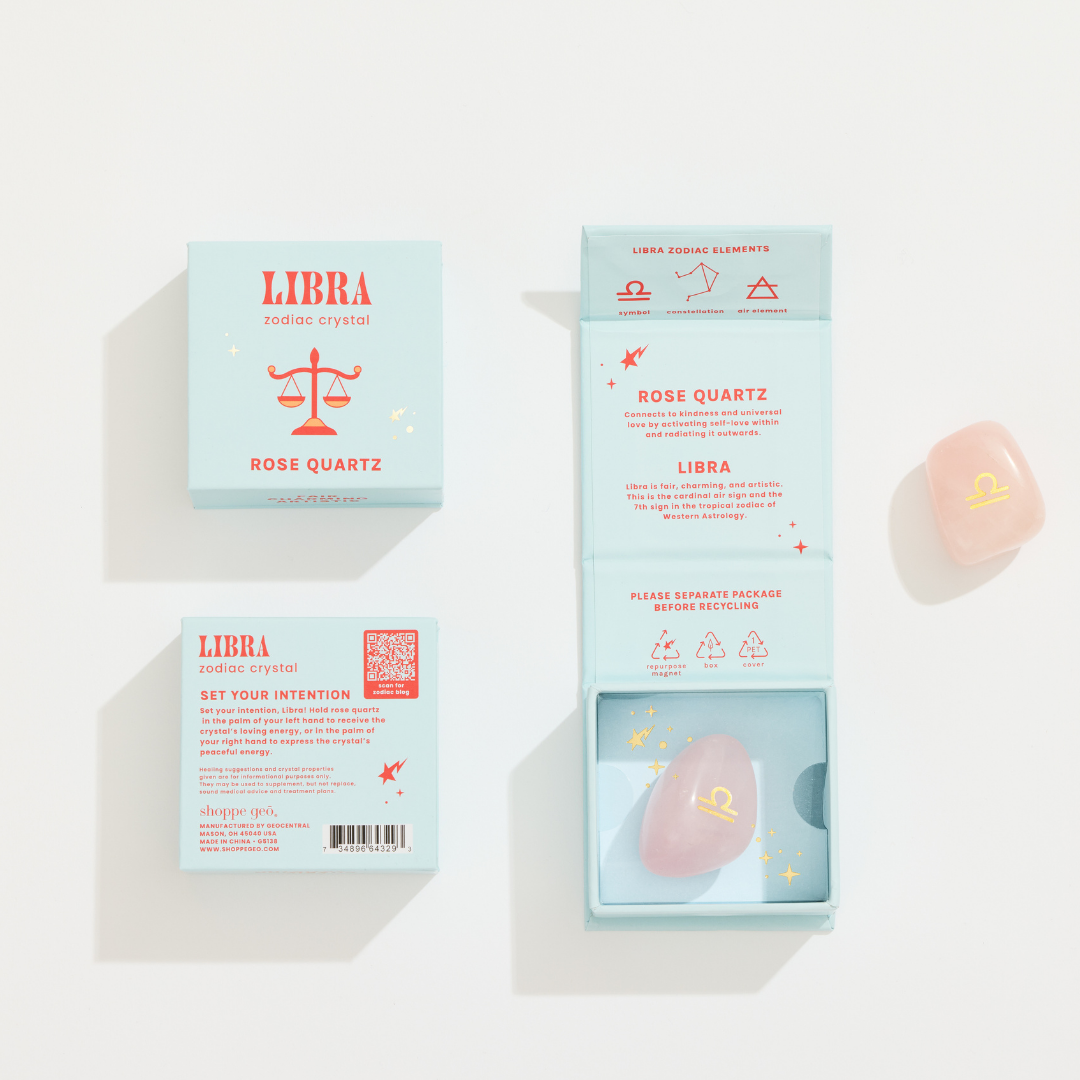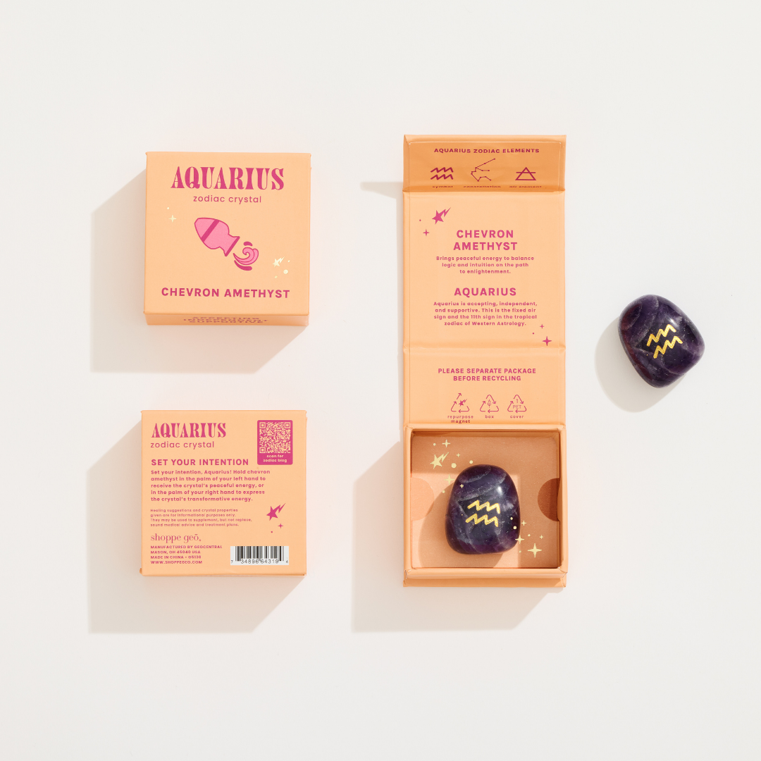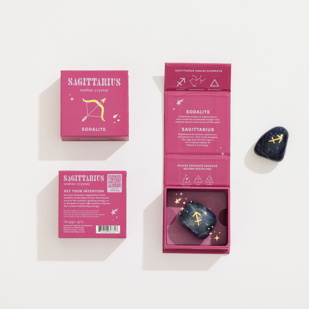 Each zodiac sign includes its own unique crystal, selected for its metaphysical associations and symbolic connection to that sign. A QR code inside the box links to bonus digital content for an added interactive touch.