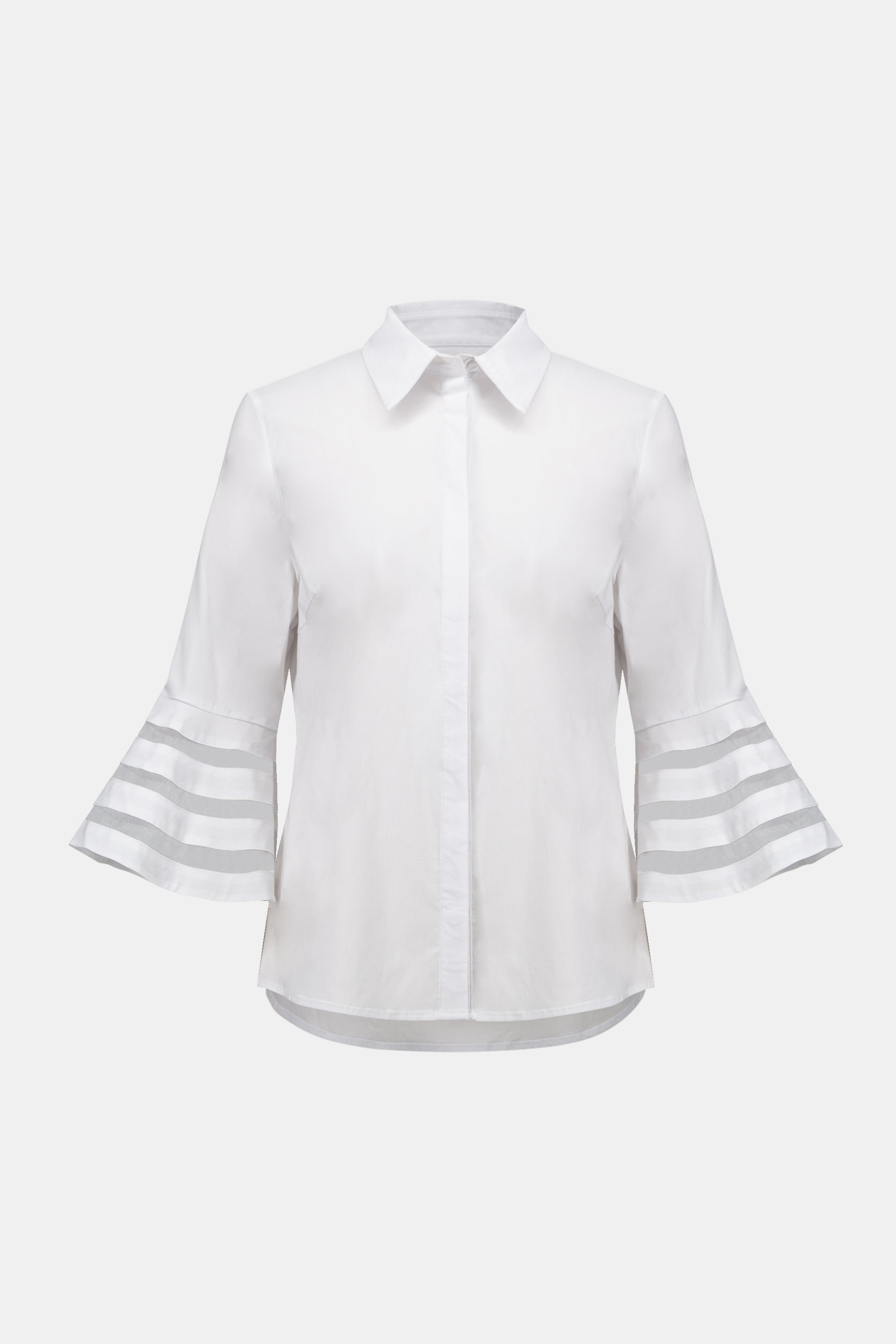 Refined yet modern, this stretch poplin blouse from Joseph Ribkoff blends crisp tailoring with soft feminine detail. Designed in a flattering straight-fit silhouette, this blouse features a classic crew neckline and statement three-quarter bell sleeves accented with sheer organza inserts.