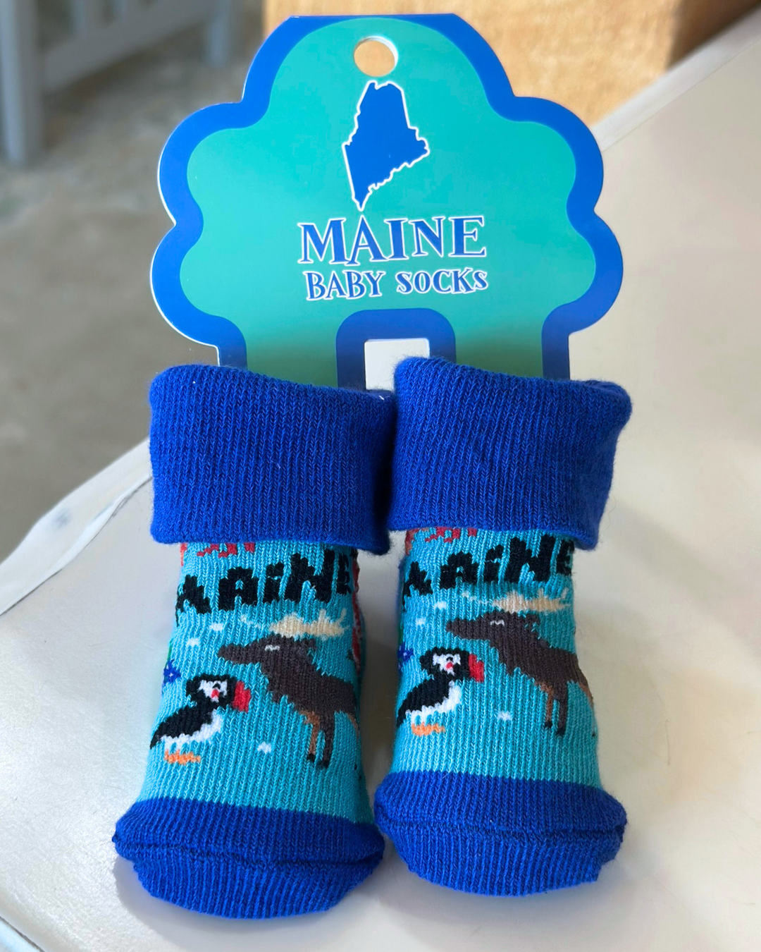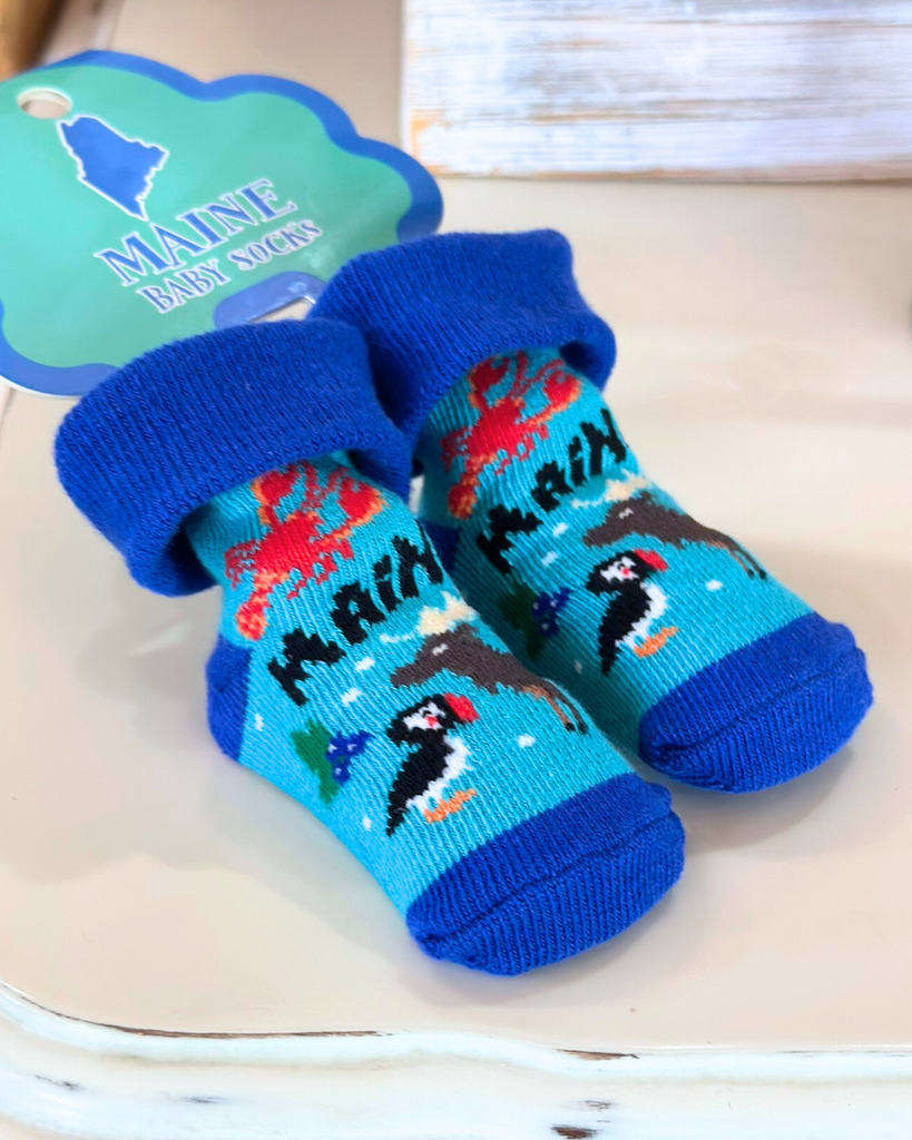 Start their love of Maine early with these adorable baby socks! Featuring a playful design filled with Maine favorites — from lobsters and lighthouses to puffins and moose — these cozy socks capture the spirit of the coast in the sweetest way. Soft, stretchy, and comfortable for little feet, they’re perfect for everyday wear or gifting to new parents.