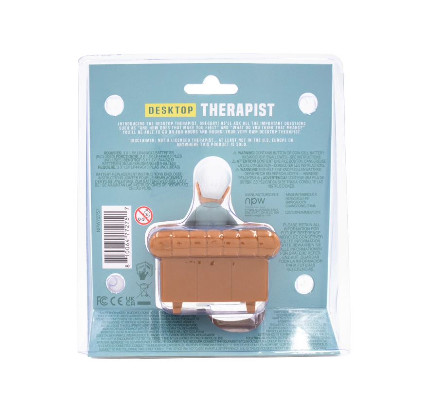 Having a stressful day? Meet your miniature voice of reason — the Desktop Therapist Sound Machine. Standing at just 3.5” tall, this tiny therapist is here to offer a dose of calm, encouragement, and humor right when you need it most. Designed with a thoughtful expression and classic therapist attire, it brings a charming and comforting presence to any workspace.