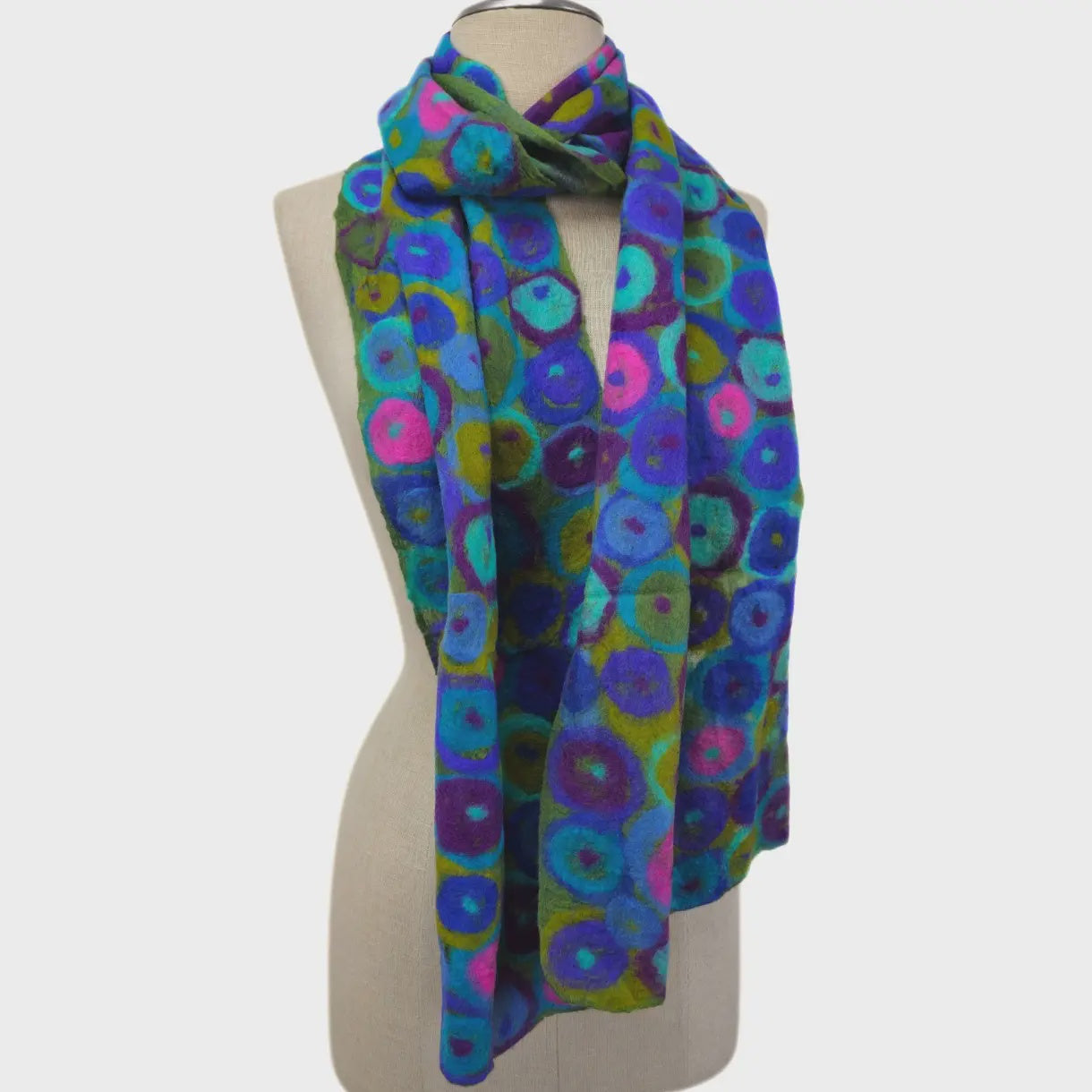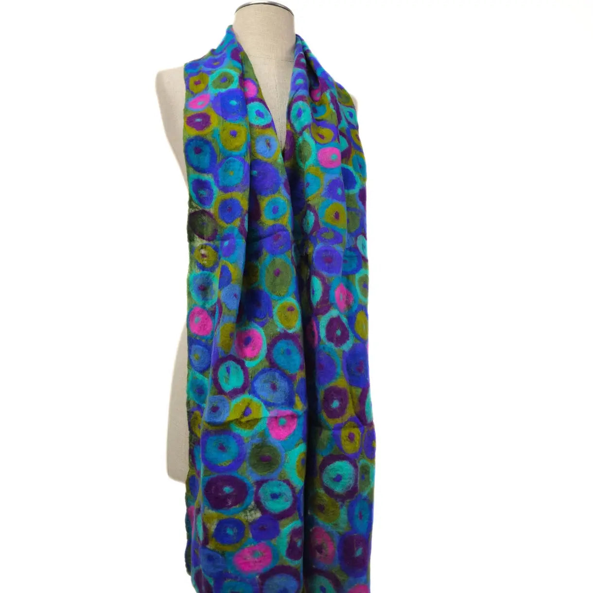 Playful, artistic, and beautifully handcrafted, the Polka Multi Dot Felt Scarf adds personality and texture to any outfit. Made using traditional wet-felting techniques, this scarf features a soft, lightweight blend of merino wool and silk that offers warmth without bulk.