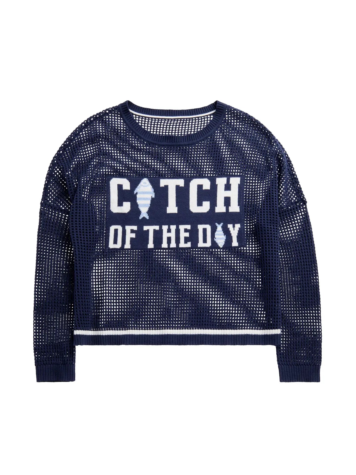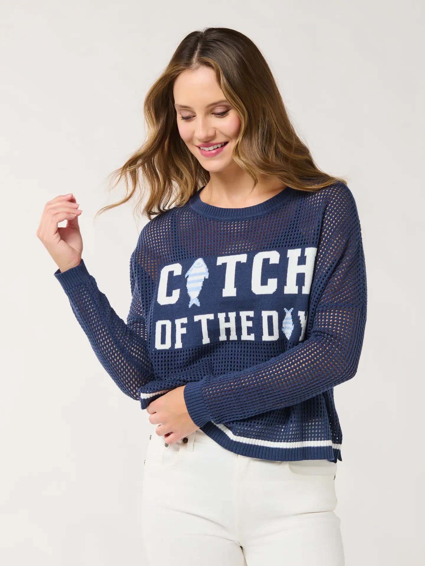 Whether you're heading out on the water, strolling through a beach town, or planning your next seaside getaway, the Catch of the Day Mesh Sweater brings effortless charm to any casual outfit.